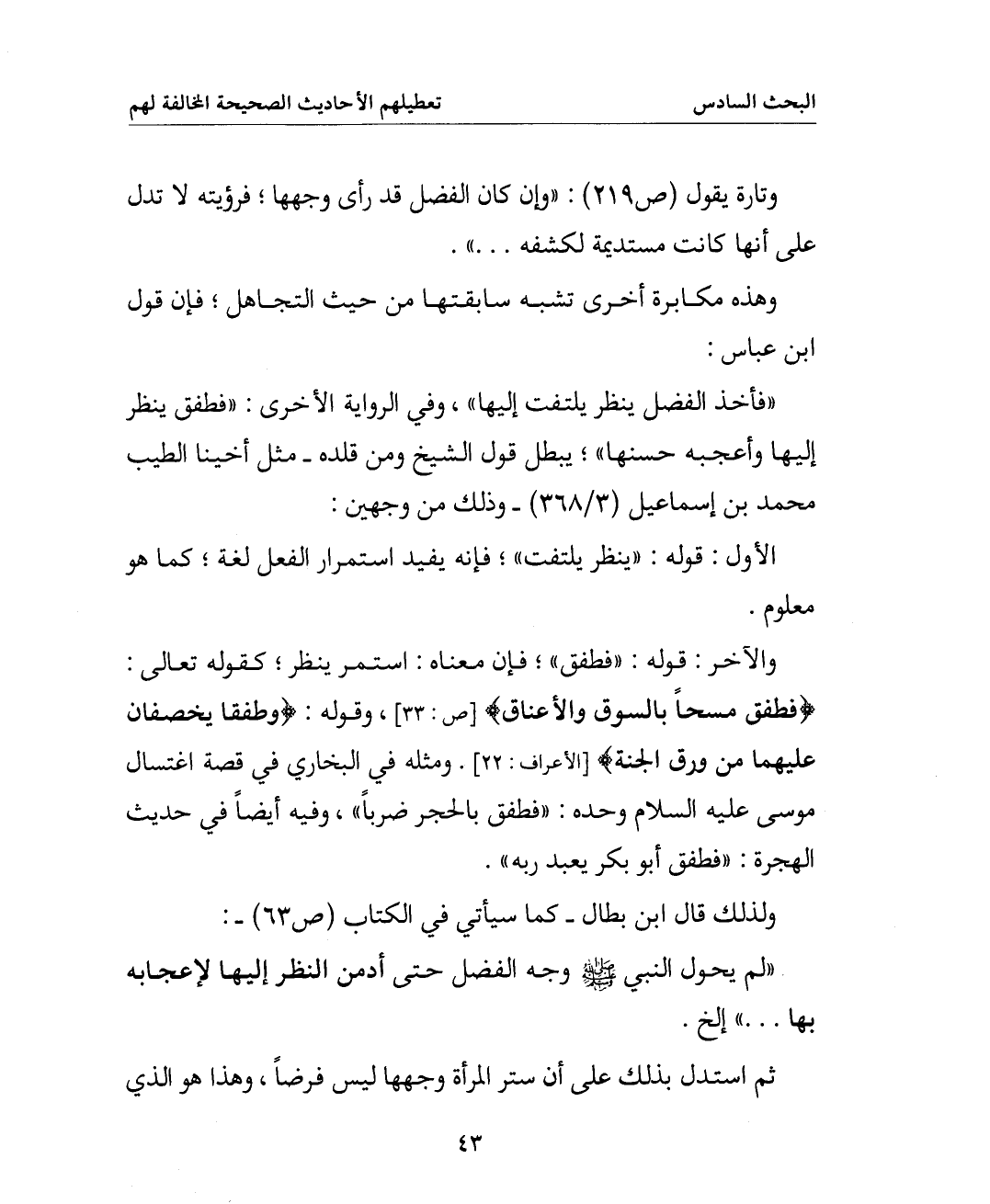 وفي الرواية الأخرى: " فطفق ينظر إليها وأعجبه حسنها " يبطل قول الشيخ ومن قلده مثل أخينا الطيب محمد بن إسماعيل (3 / 368) - وذلك من وجهين: