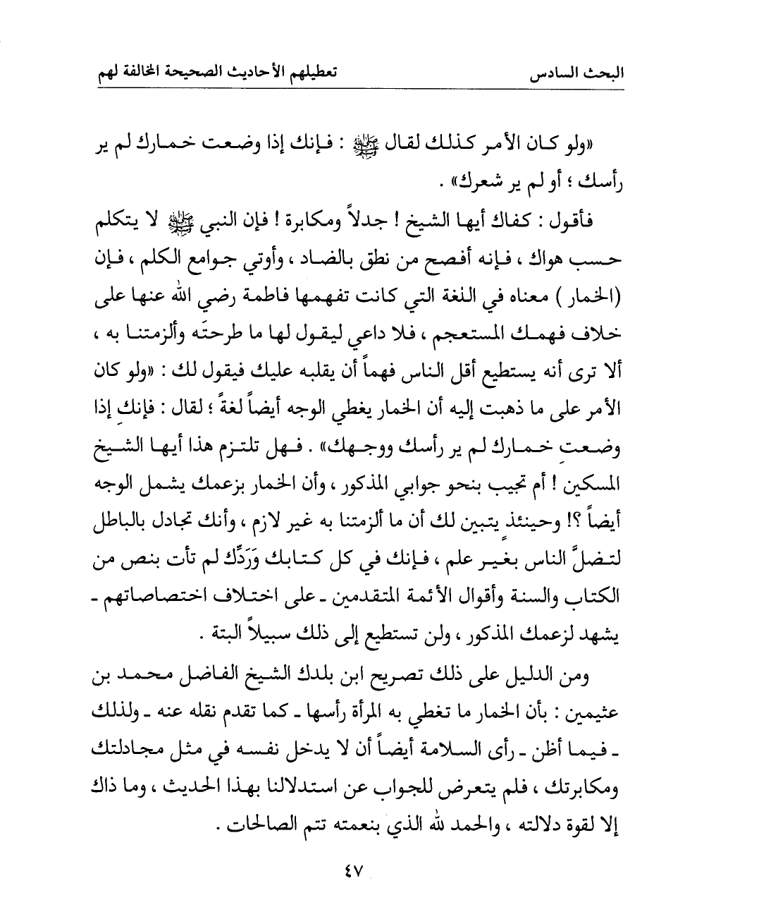 فأقول: كفاك أيها الشيخ جدلا ومكابرة فإن النبي A لا يتكلم حسب هواك فإنه أفصح من نطق بالضاد وأوتي جوامع الكلم فإن (الخمار) معناه في اللغة التي كانت تفهمها فاطمة Bها على خلاف فهمك المستعجم فلا داعي ليقول لها ما طرحته وألزمتنا به ألا ترى أنه يستطيع أقل الناس فهما أن يقلبه عليك فيقول لك: " ولو كان الأمر على ما ذهبت إليه أن الخمار يغطي الوجه أيضا لغة لقال: فإنك إذا وضعت خمارك لم ير رأسك ووجهك ". فهل تلتزم هذا أيها الشيخ المسكين أم تجيب بنحو جوابي المذكور وأن الخمار بزعمك يشمل الوجه أيضا؟ وحينئذ يتبين لك أن ما ألزمتنا به غير لازم وأنك تجادل بالباطل لتضل الناس بغير علم فإنك في كل كتابك وردك لم تأت بنص من الكتاب والسنة وأقوال الأئمة المتقدمين - على اختلاف اختصاصاتهم - يشهد لزعمك المذكور ولن تستطيع إلى ذلك سبيلا البتة
