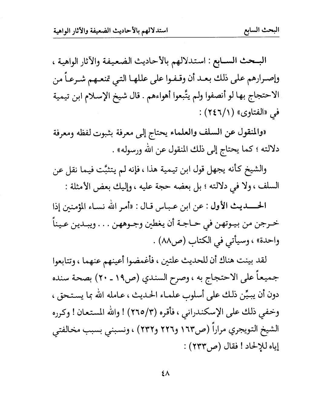 البحث السابع: استدلالهم بالأحاديث الضعيفة والآثار الواهية وإصرارهم على ذلك بعد أن وقفوا على عللها التي تمنعهم شرعا من الاحتجاج بها لو أنصفوا ولم يتبعوا أهواءهم. قال شيخ الإسلام ابن تيمية في " الفتاوى " (1 / 246) :