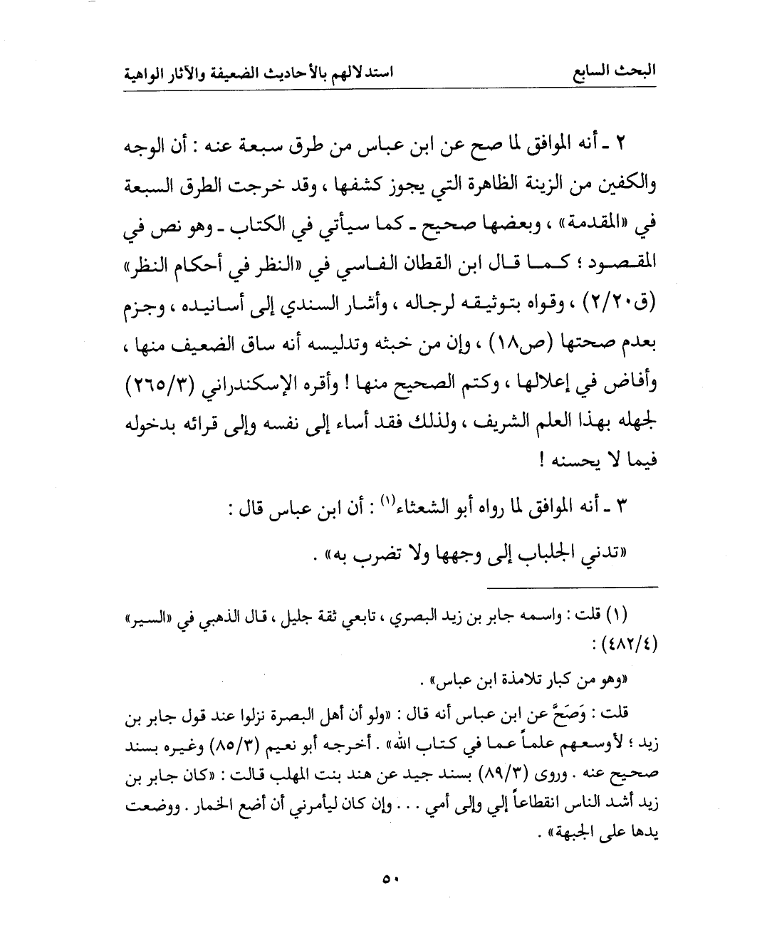 قلت: وصح عن ابن عباس أنه قال: " ولو أن أهل البصرة نزلوا عند قول جابر بن زيد لأوسعهم علما عما في كتاب الله ". أخرجه أبو نعيم (3 / 85) وغيره بسند صحيح عنه. وروى (3 / 89) بسند جيد عن هند بنت المهلب قالت: " كان جابر بن زيد أشد الناس انقطاعا إلى وإلى أمي. . . وإن كان ليأمرني أن أضع الخمار. ووضعت يدها على الجبهة "