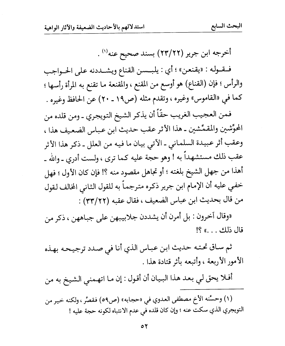 (1) وحسنه الأخ مصطفى العدوي في " حجابه " (ص 59) فقصر ولكنه خير من التويجري الذي سكت عنه وإن كان قلده في عدم الانتباه لكونه حجة عليه