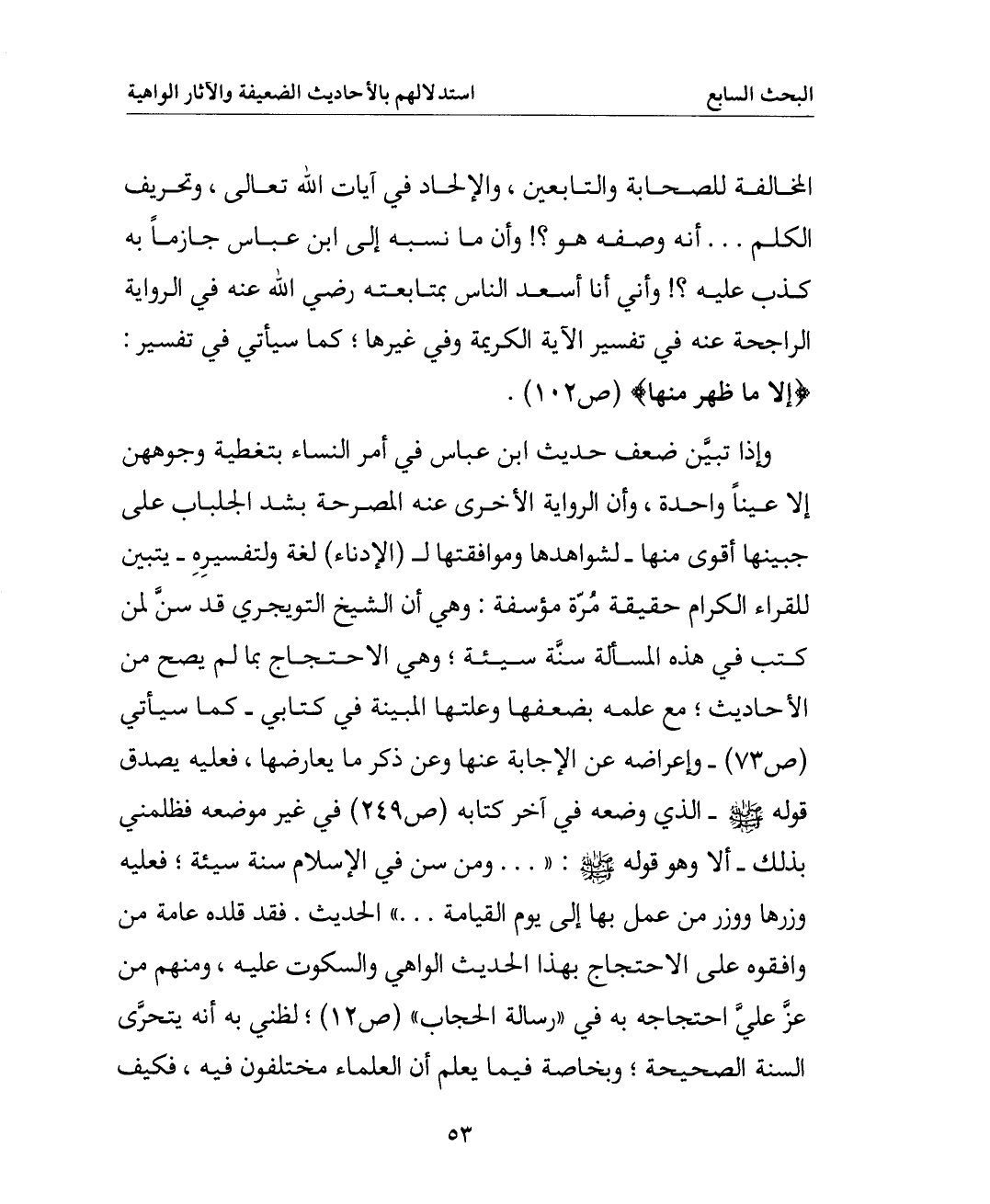وإذا تبين ضعف حديث ابن عباس في أمر النساء بتغطية وجوههن إلا عينا واحدة وأن الرواية الأخرى عنه المصرحة بشد الجلباب على جبينها أقوى منها - لشواهدها وموافقتها (الإدناء) لغة ولتفسيره - يتبين للقراء الكرام حقيقة مرة مؤسفة: وهي أن الشيخ التويجري قد سن لمن كتب في هذه المسألة سنة سيئة وهي الاحتجاج بما لم يصح من الأحاديث مع علمه بضعفها وعلتها المبينة في كتابي - كما سيأتي (ص 73) - وإعراضه عن الإجابة عنها وعن ذكر ما يعارضها فعليه يصدق قوله A - والذي يضعه في آخر كتابه (ص 249) في غير موضعه فظلمني بذلك - ألا وهو قوله A: ". . . ومن سن في الإسلام سنة سيئة فعليه وزرها ووزر من عمل بها إلى يوم القيامة. . . " الحديث. فقد قلده عامة من وافقه على الاحتجاج بهذا الحديث الواهي والسكوت عليه ومنهم من عز علي احتجاجه به في " رسالة الحجاب " (ص 12) لظني أنه يتحرى السنة الصحيحة وبخاصة فيما يعلم أن العلماء مختلفون فيه فكيف