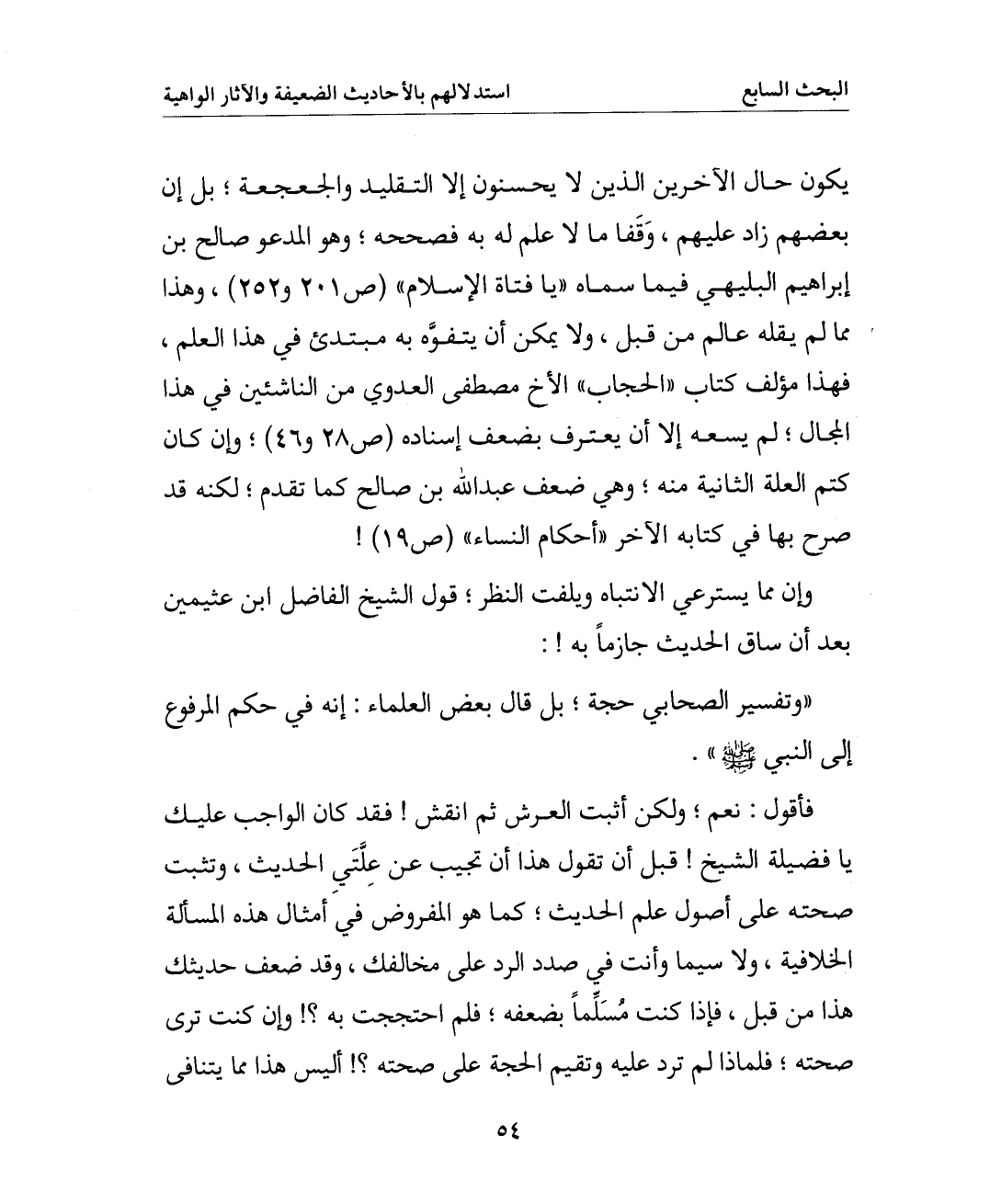 يكون حال الآخرين الذين لا يحسنون إلا التقليد والجعجعة بل إن بعضهم زاد عليهم وقفا ما لا علم له به فصححه وهو المدعو صالح بن إبراهيم البليهي فيما سماه " يا فتاة الإسلام " (ص 201 و 252) وهذا مما لم يقله عالم من قبل ولا يمكن أن يتفوه به مبتدئ في هذا العلم فهذا مؤلف كتاب " الحجاب " الأخ مصطفى العدوي من الناشئين في هذا المجال لم يسعه إلا أن يعترف بضعف إسناده (ص 28 و 46) وإن كان كتم العلة الثانية منه وهي ضعف عبد الله بن صالح كما تقدم لكنه قد صرح بها في كتابه الآخر " أحكام النساء " (ص 19)