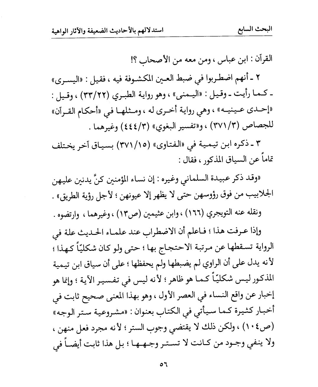 وإذا عرفت هذا فاعلم أن الاضطراب عند علماء الحديث علة في الرواية تسقطها عن مرتبة الاحتجاج بها حتى ولو كان شكليا كهذا لأنه يدل على أن الراوي لم يضبطها ولم يحفظها على أن سياق ابن تيمية المذكور ليس شكليا كما هو ظاهر لأنه ليس في تفسير الآية وإنما هو إخبار عن واقع النساء في العصر الأول وهو بهذا المعنى صحيح ثابت في أخبار كثيرة كما سيأتي في الكتاب بعنوان: " مشروعية ستر الوجه " (ص 104) ولكن ذلك لا يقتضي وجوب الستر لأنه مجرد فعل منهن ولا ينافي وجود من كانت لا تستر وجهها بل هذا ثابت أيضا في