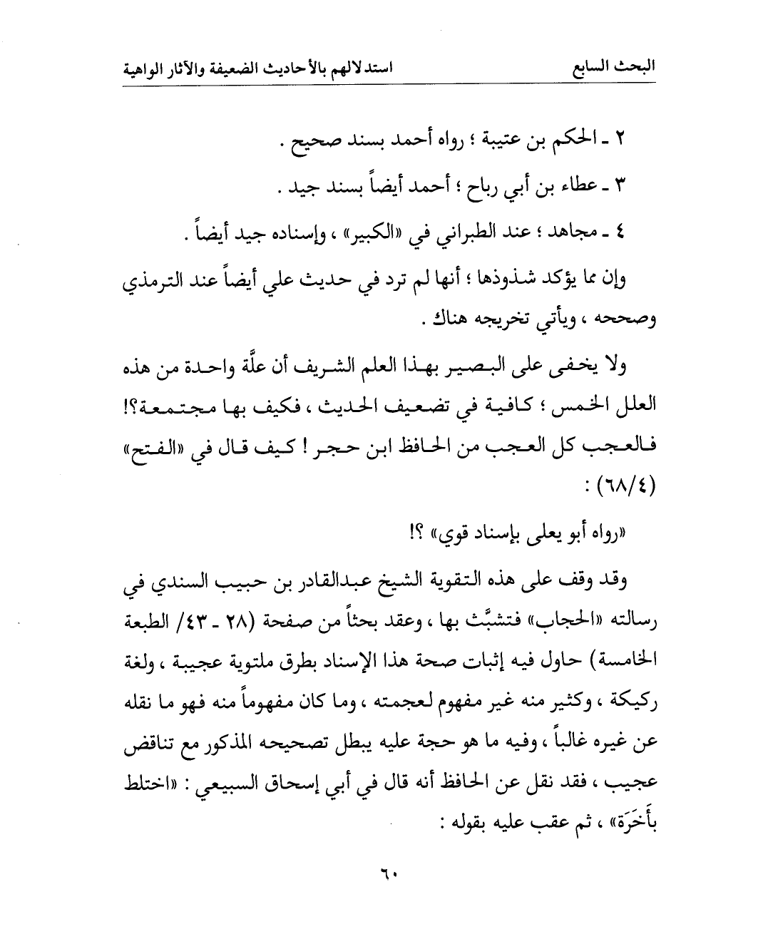 وقد وقف على هذه التقوية الشيخ عبد القادر بن حبيب السندي في رسالته " الحجاب " فتشبث بها وعقد بحثا من صفحة (27 - 43 / الطبعة الخامسة) حاول فيه إثبات صحة هذا الإسناد بطرق ملتوية عجيبة ولغة ركيكة وكثير منه غير مفهوم لعجمته وما كان مفهوما منه فهو ما نقله عن غيره غالبا وفيه ما هو حجة عليه يبطل تصحيحه المذكور مع تناقض عجيب فقد نقل عن الحافظ أنه قال في أبي إسحاق السبيعي: " اختلط بأخرة " ثم عقب بقوله: