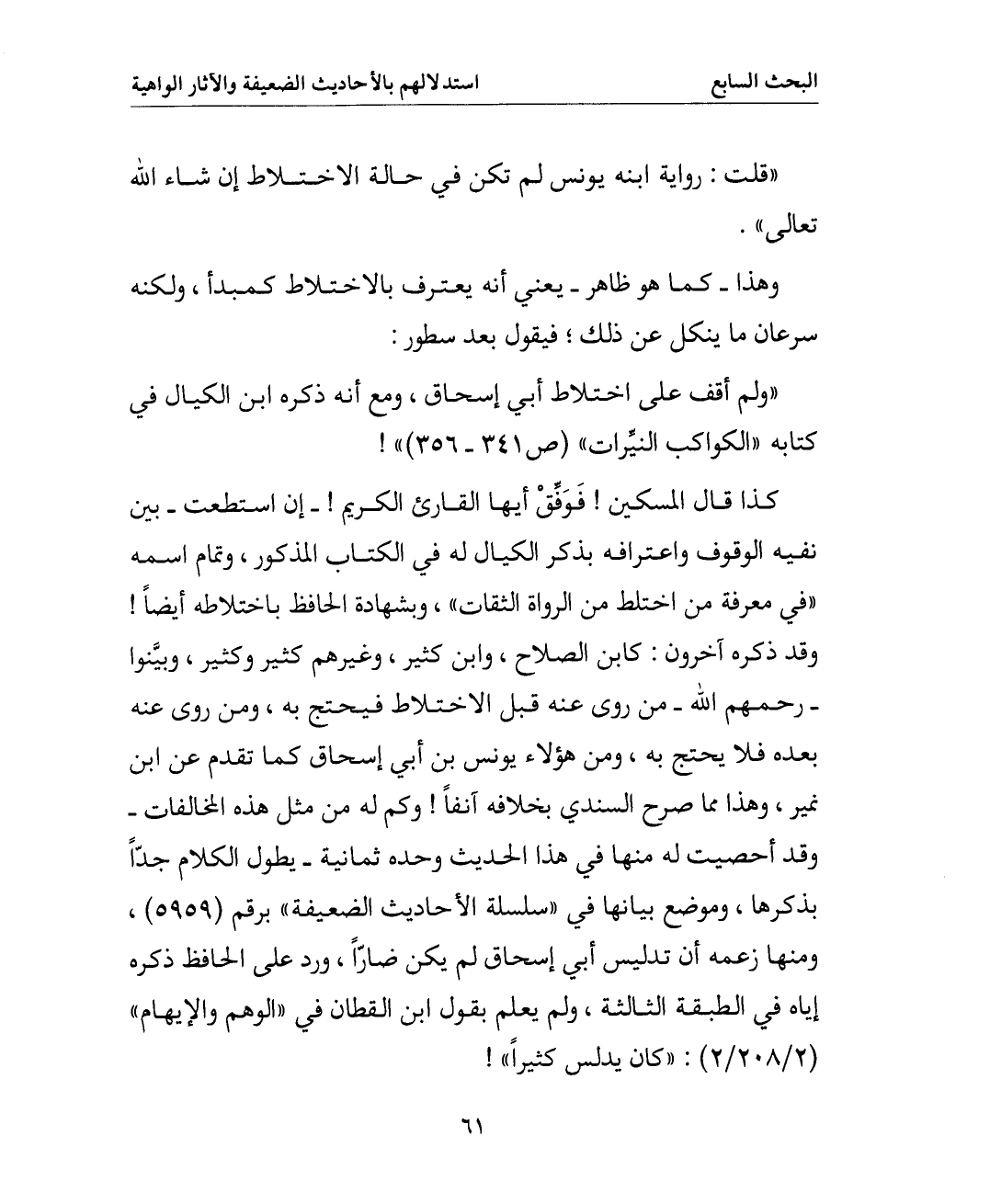كذا قال المسكين فوفق أيها القارئ الكريم - إن استطعت - بين نفيه الوقوف واعترافه بذكر الكيال له في الكتاب المذكور وتمام اسمه " في معرفة من اختلط من الرواة الثقات " وبشهادة الحافظ باختلاطه أيضا وقد ذكره آخرون: كابن الصلاح وابن كثير وغيرهم كثير وكثير وبينوا - رحمهم الله - من روى عنه قبل الاختلاط فيحتج به ومن روى عنه بعده فلا يحتج به ومن هؤلاء يونس بن أبي إسحاق كما تقدم عن ابن نمير وهذا مما صرح السندي بخلافه آنفا وكم له من مثل هذه المخالفات - وقد أحصيت له منها في الحديث وحده ثمانية - يطول الكلام جدا بذكرها وموضع بيانها في " سلسلة الأحاديث الضعيفة " برقم (5959) ومنها زعمه أن تدليس أبي إسحاق لم يكن ضارا ورد على الحافظ ذكره إياه في الطبقة الثالثة ولم يعلم بقول ابن القطان في " الوهم والإيهام " (2 / 208 / 2) : " كان يدلس كثيرا "