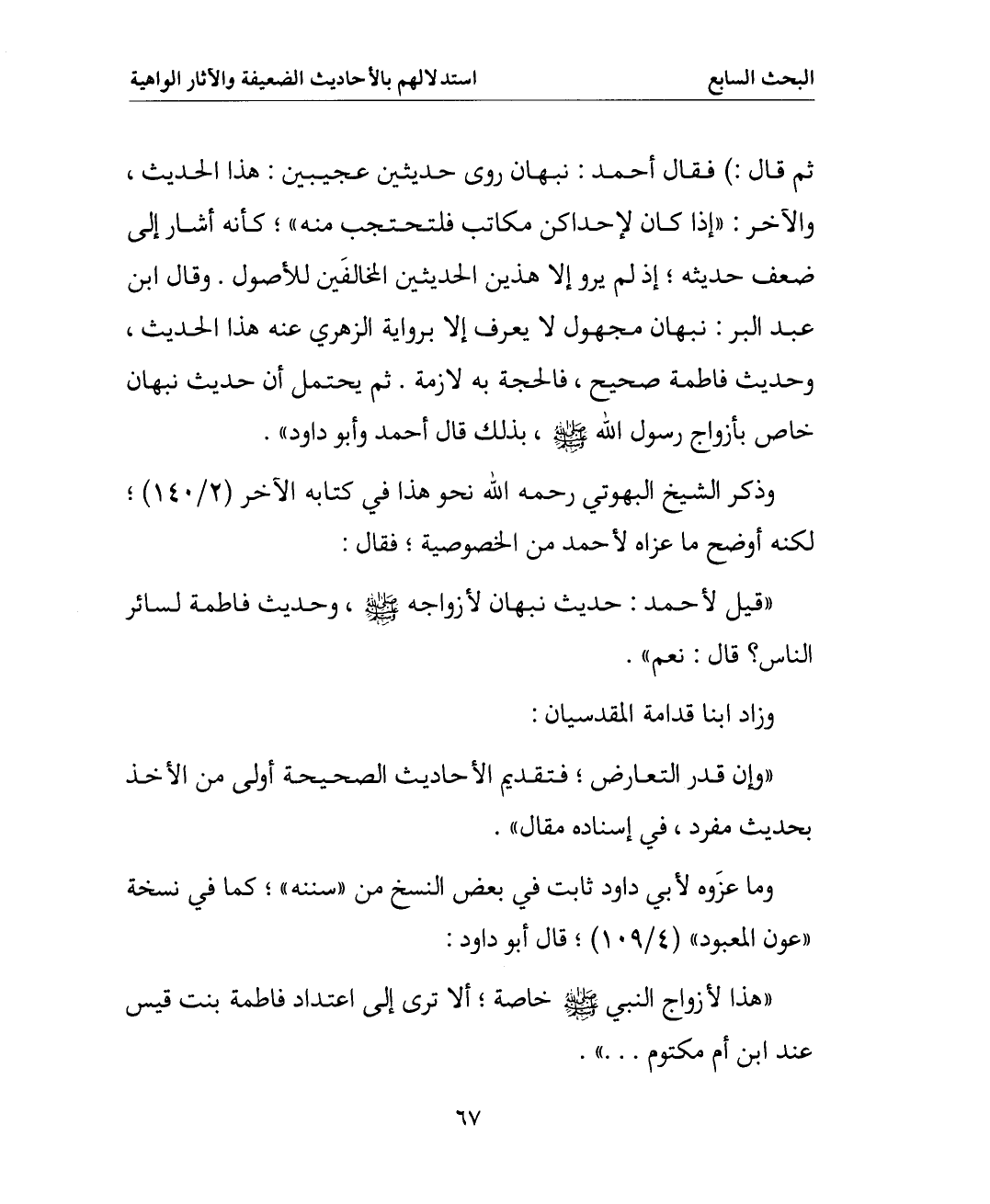 ثم قال:) فقال أحمد نبهان روى حديثين عجيبين: هذا الحديث والآخر: " إذا كان لإحداكن مكاتب فلتحتجب منه " كأنه أشار إلى ضعف حديثه إذا لم يرو إلا هذين الحديثين المخالفين للأصول. وقال ابن عبد البر: نبهان مجهول لا يعرف إلا برواية الزهري عنه هذا الحديث وحديث فاطمة صحيح فالحجة لازمة. ثم يحتمل أن حديث نبهان خاص بأزواج رسول الله A بذلك قال أحمد وأبو داود "