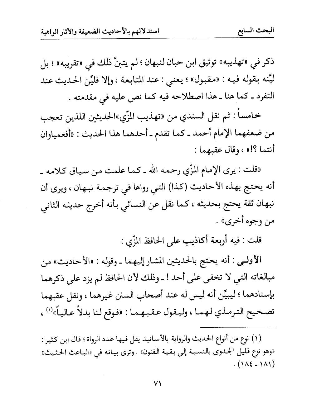 قلت: يرى الإمام المزي C - كما علمت من سياق كلامه - أنه يحتج بهذه الأحاديث (كذا) التي رواها في ترجمة نبهان ويرى أن نبهان ثقة يحتج بحديثه كما نقل عن النسائي بأنه أخرج حديثه الثاني من وجوه أخرى