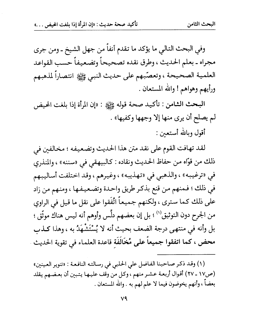 وفي البحث التالي ما يؤكد ما تقدم آنفا من جهل الشيخ - ومن جرى مجراه - بعلم الحديث وطرق نقده تصحيحا وتضعيفا حسب القواعد العلمية الصحيحة وتعصبهم على حديث النبي A انتصارا لمذهبهم ورأيهم وهواهم والله المستعان