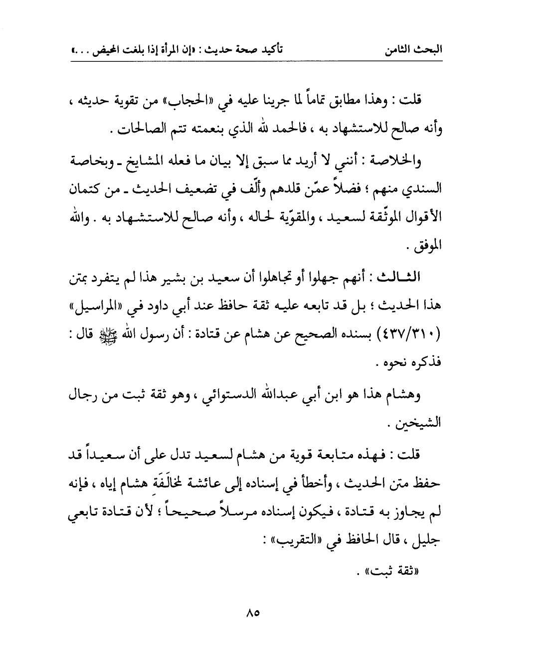 قلت: فهذه متابعة قوية من هشام لسعيد تدل على أن سعيدا قد حفظ متن الحديث وأخطأ في إسناده إلى عائشة لمخالفة هشام إياه فإنه لم يجاوز به قتادة فيكون إسناده مرسلا صحيحا لأن قتادة تابعي جليل قال الحافظ في " التقريب ":