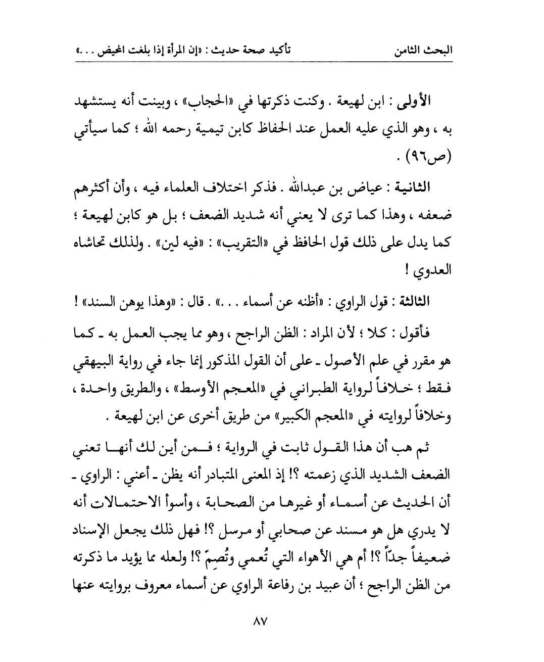 ثم هب أن هذا القول ثابت في الرواية فمن أين لك أنها تعني الضعف الشديد الذي زعمته؟ إذ المعنى المتبادر أنه يظن - أعني: الراوي - أن الحديث عن أسماء أو غيرها من الصحابة وأسوأ الاحتمالات أنه لا يدري هل هو مسند عن صحابي أو مرسل؟ فهل ذلك يجعل الإسناد ضعيفا جدا؟ أم هي الأهواء التي تعمي وتصم؟ ولعله مما يؤيد ما ذكرته من الظن الراجح أن عبيد بن رفاعة الراوي عن أسماء معروفة بروايته عنها