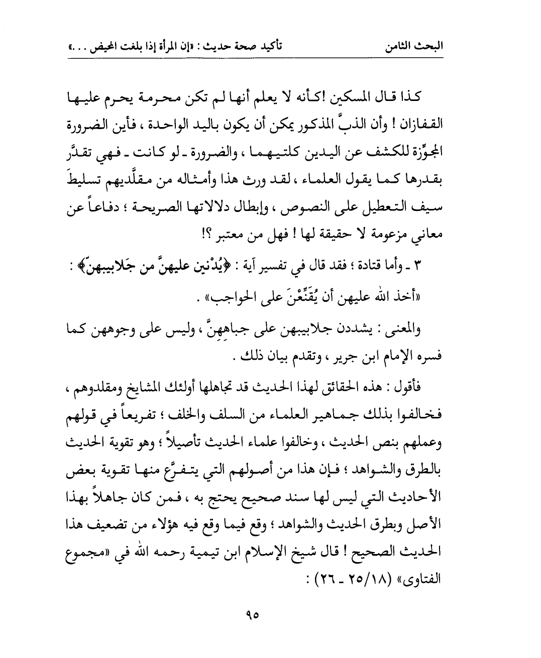 والمعنى: يشددن جلابيبهن على جباههن وليس على وجوههن كما فسره الإمام ابن جرير وتقدم بيان ذلك. فأقول: هذه الحقائق لهذا الحديث قد تجاهلها أولئك المشايخ ومقلدوهم فخالفوا بذلك جماهير العلماء من السلف والخلف تفريعا في قولهم وعملهم بنص الحديث وخالفوا علماء الحديث تأصيلا وهو تقوية الحديث بالطرق والشواهد فإن هذا من أصولهم التي تفرع منها تقوية بعض الأحاديث التي ليس لها سند صحيح يحتج به فمن كان جاهلا بهذا الأصل وبطرق الحديث والشواهد وقع فيما وقع فيه هؤلاء من تضعيف هذا الحديث الصحيح قال شيخ الإسلام ابن تيمية C في " مجموع الفتاوى " (18 / 25 - 26) :