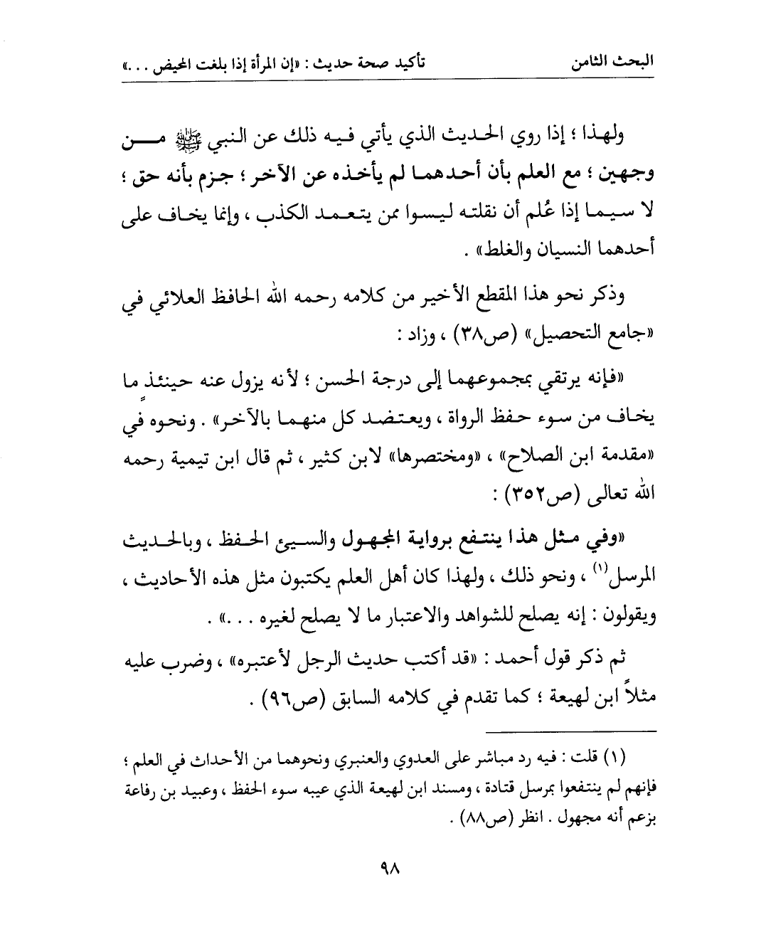 (1) قلت: فيه رد مباشر على العدوي والعنبري ونحوهما من الأحداث في العلم فإنهم لم ينتفعوا بمرسل قتادة ومسند ابن لهيعة الذي عيبه سوء الحفظ وعبيد بن رفاعة بزعم أنه مجهول. انظر (ص 88)