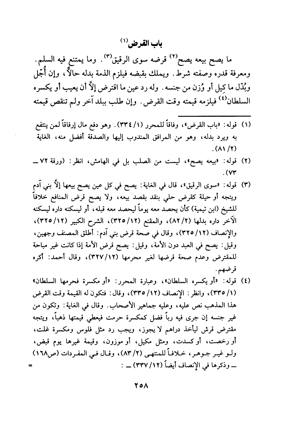(¬4) قوله: "أو يكسره السلطان"، وعبارة المحرر: "أو مكسرة فحرمها السلطان" (1/ 335)، وانظر: الإِنصاف (12/ 335)، وقال: فتكون له القيمة وقت القرض هذا المذهب نص عليه، وعليه جماهير الأصحاب. وقال في الغاية: وتكون من غير جنسه إن جرى فيه ربًا فضل كمكسرة حرمت فيعطي قيمتها ذهبًا، ويتجه مقترض قرش ليأخذ دراهم لا يجوز، ويجب رد مثل فلوس ومكسرة غلت، أو رخصت، أو كسدت، ومثل مكيل، أو موزون، وقيمة غيرها يوم قبض، ولو غير جوهر، خلافًا للمنتهى (2/ 83)، وقال في المفردات (ص 168) -وذكرها في الإنصاف أيضًا (12/ 337) -: =