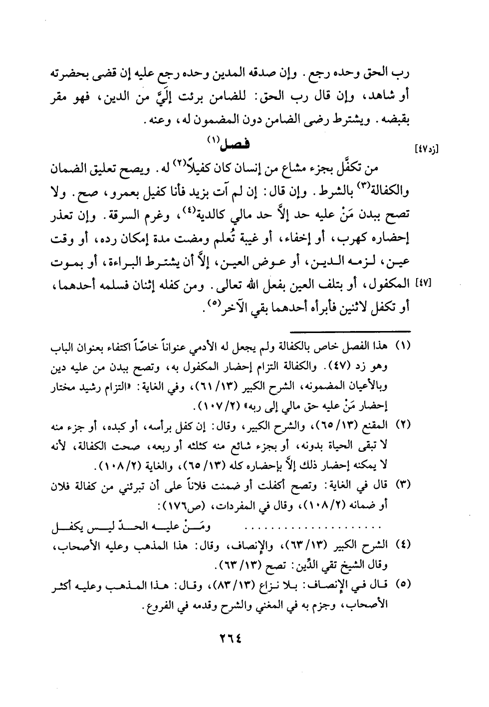 (¬1) هذا الفصل خاص بالكفالة ولم يجعل له الأدمي عنوانًا خاصًّا اكتفاء بعنوان الباب وهو زد (47). والكفالة التزام إحضار المكفول به، وتصح ببدن من عليه دين وبالأعيان المضمونه، الشرح الكبير (13/ 61)، وفي الغاية: "التزام رشيد مختار إحضار مَنْ عليه حق مالي إلى ربه" (2/ 107).