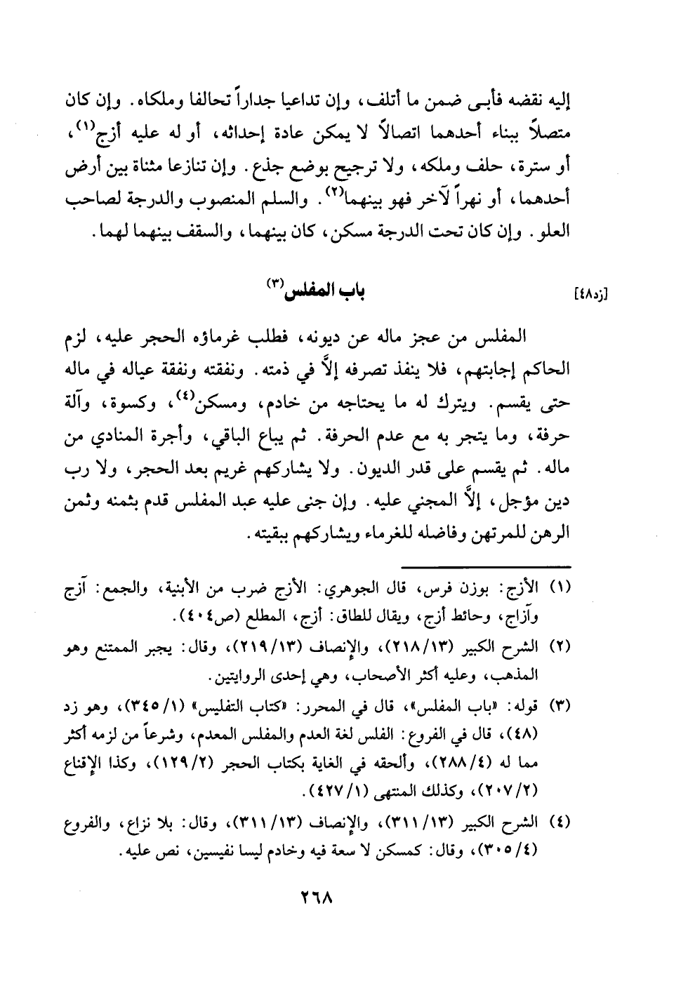 (¬3) قوله: "باب المفلس"، قال في المحرر: "كتاب التفليس" (1/ 345)، وهو زد (48)، قال في الفروع: الفلس لغة العدم والمفلس المعدم، وشرعًا من لزمه أكثر مما له (4/ 288)، وألحقه في الغاية بكتاب الحجر (2/ 129)، وكذا الإقناع (2/ 207)، وكذلك المنتهى (1/ 427).