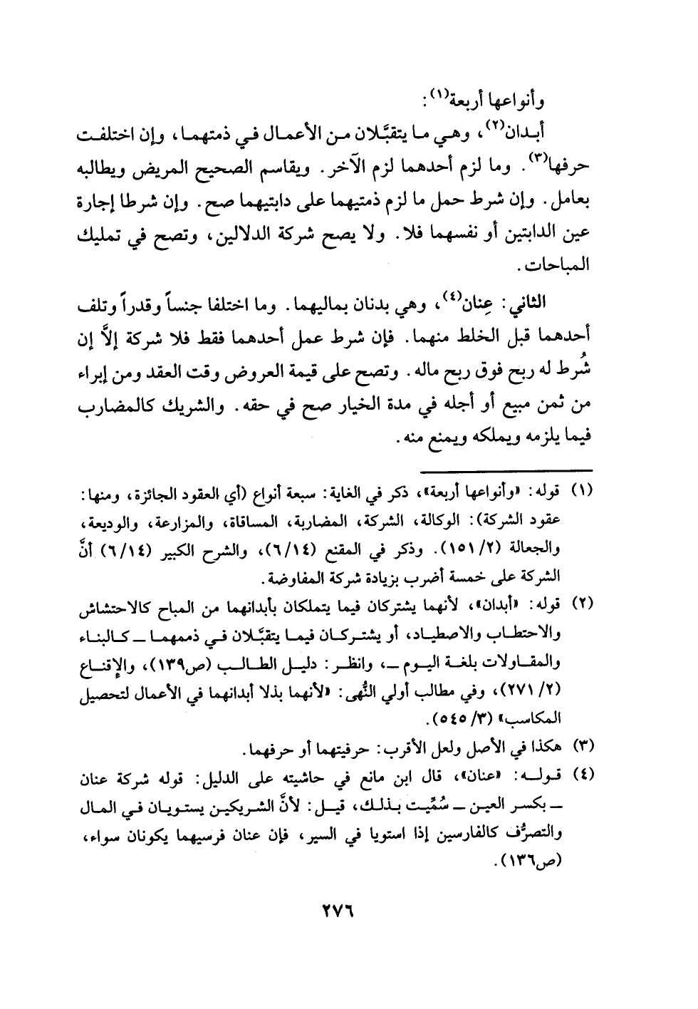 (¬4) قوله: "عنان"، قال ابن مانع في حاشيته على الدليل: قوله شركة عنان -بكسر العين- سُمِّيت بذلك، قيل: لأن الشريكين يستويان في المال والتصرُّف كالفارسين إذا استويا في السير، فإن عنان فرسيهما يكونان سواء، (ص 136).