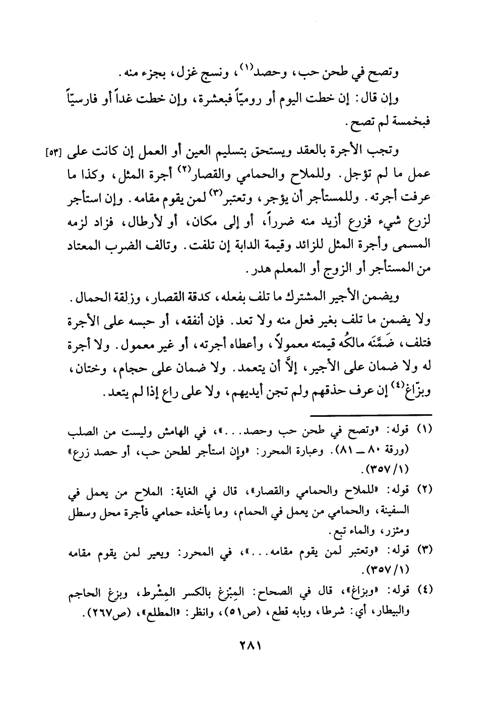 (¬1) قوله: "وتصح في طحن حب وحصد. . . "، في الهامش وليست من الصلب (ورقة 80 - 81). وعبارة المحرر: "وإِن استأجر لطحن حب، أو حصد زرع" (1/ 357).