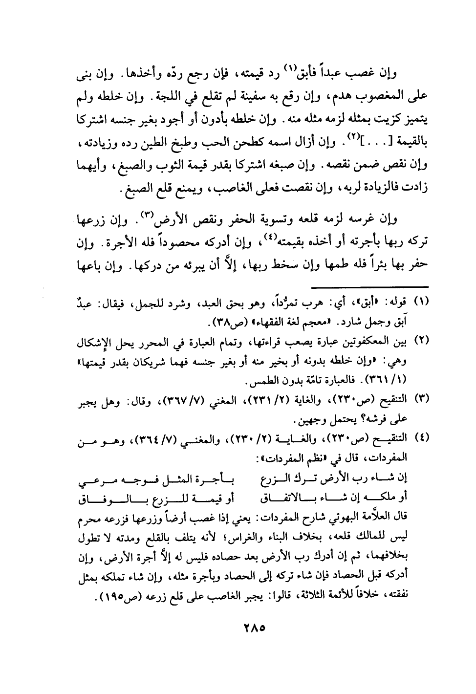 قال العلَّامة البهوتي شارح المفردات: يعني إذا غصب أرضًا وزرعها فزرعه محرم ليس للمالك قلعه، بخلاف البناء والغراس؛ لأنه يتلف بالقلع ومدته لا تطول بخلافهما، ثم إن أدرك رب الأرض بعد حصاده فليس له إلّا أجرة الأرض، وإن أدركه قبل الحصاد فإن شاء تركه إلى الحصاد وبأجرة مثله، وإن شاء تملكه بمثل نفقته، خلافًا للأئمة الثلاثة، قالوا: يجبر الغاصب على قلع زرعه (ص 195).