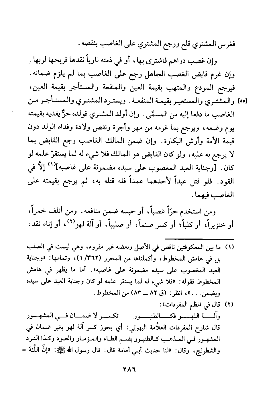(¬1) ما بين المعكوفتين ناقص في الأصل وبعضه غير مقروء، وهي ليست في الصلب بل في هامش المخطوط، وأكملناها من المحرر (1/ 362)، وتمامها: "وجناية العبد المغصوب على سيده مضمونة على غاصبه". أما ما يظهر في هامش المخطوط فقوله: "فلا شيء له لما يستقر علمه لو كان وجناية العبد على سيده ويضمن. . . "، انظر: (ق 82 - 83) من المخطوط.