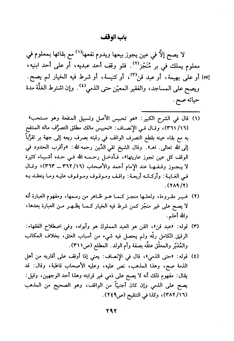 (¬1) قال في الشرح الكبير: "هو تحبيس الأصل وتسبيل المنفعة وهو مستحب" (16/ 361)، وقال في الإنصاف: "تحبيس مالك مطلق التصرُّف ماله المنتفع به مع بقاء عينه بقطع التصرف الواقف في رقبته بصرف ريعه إلى جهة بر تقرُّبًا إلى اللَّه تعالى. اهـ". وقال الشيخ تقي الدين رحمه اللَّه: "وأقرب الحدود في الوقف كل عين تجوز عاريتها"، فأدخل رحمه اللَّه في حده أشياء كثيرة لا يجوز وقفها عند الإمام أحمد والأصحاب (16/ 362 - 363)؛ وقال في الغاية: وأركانه أربعة: واقف وموقوف وموقوف عليه وما ينعقد به (2/ 289).