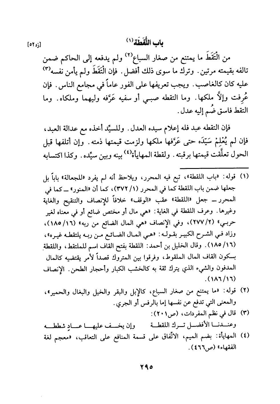 (¬1) قوله: "باب اللقطة"، تبع فيه المحرر، ويلاحظ أنه لم يفرد "للجعالة" بابًا بل جعلها ضمن باب اللقطة كما في المحرر (1/ 372)، كما أن "المنور" -كما في المحرر- جعل "اللقطة" عقب "الوقف" خلافًا للإنصاف والتنقيح والغاية وغيرها. وعرف اللقطة في الغاية: "هي مال أو مختص ضائع أو في معناه لغير حربي" (2/ 277)، وفي الإِنصاف "هي المال الضائع من ربه" (16/ 185)، وزاد في الشرح الكبير بقوله: "هي المال الضائع من ربه يلتقطه غيره"، (16/ 185). وقال الخليل بن أحمد: اللقطة بفتح القاف اسم للملتقط، واللقطة بسكون القاف المال الملقوط، وفرقوا بين المتروك قصدًا لأمر يقتضيه كالمال المدفون والشيء الذي يترك ثقة به كالخشب الكبار وأحجار الطحن. الإنصاف (16/ 186).
