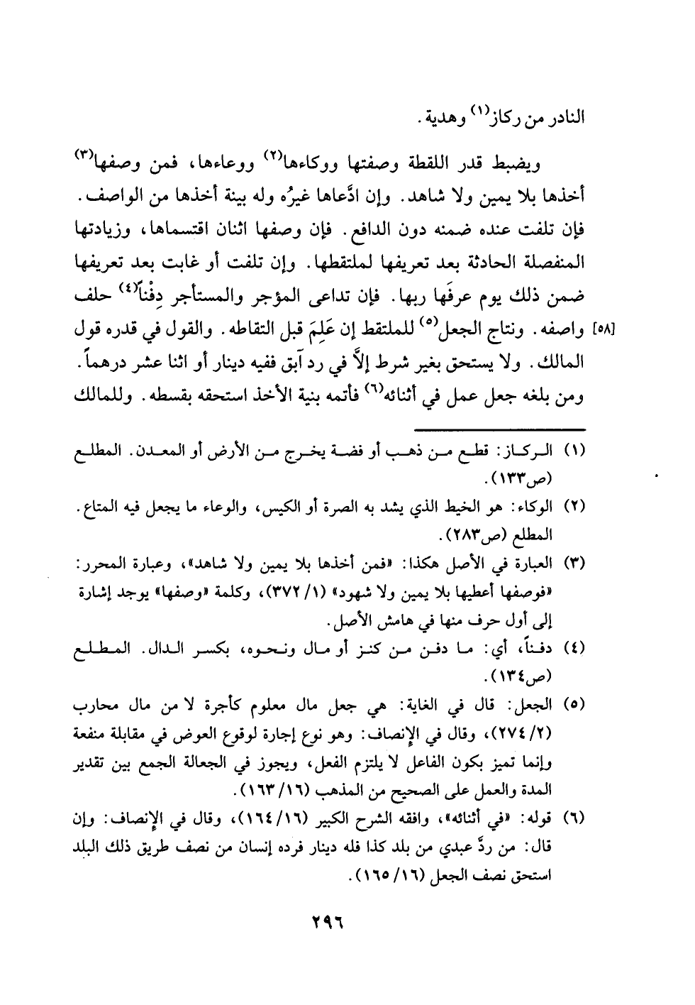 (¬6) قوله: "في أثنائه"، وافقه الشرح الكبير (16/ 164)، وقال في الإِنصاف: وإن قال: من ردَّ عبدي من بلد كذا فله دينار فرده إنسان من نصف طريق ذلك البلد استحق نصف الجعل (16/ 165).