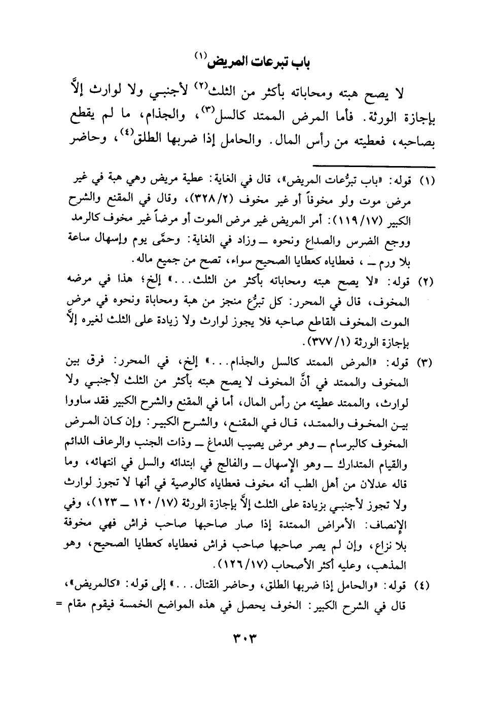 (¬3) قوله: "المرض الممتد كالسل والجذام. . . " إلخ، في المحرر: فرق بين المخوف والممتد في أنَّ المخوف لا يصح هبته بأكثر من الثلث لأجنبي ولا لوارث، والممتد عطيته من رأس المال، أما في المقنع والشرح الكبير فقد ساووا بين المخوف والممتد، قال في المقنع، والشرح الكبير: وإن كان المرض المخوف كالبرسام -وهو مرض يصيب الدماغ- وذات الجنب والرعاف الدائم والقيام المتدارك -وهو الإِسهال- والفالج في ابتدائه والسل في انتهائه، وما قاله عدلان من أهل الطب أنه مخوف فعطاياه كالوصية في أنها لا تجوز لوارث ولا تجوز لأجنبي بزيادة على الثك إلَّا بإجازة الورثة (17/ 120 - 123)، وفي الإِنصاف: الأمراض الممتدة إذا صار صاحبها صاحب فراش فهي مخوفة بلا نزاع، وإن لم يصر صاحبها صاحب فراش فعطاياه كعطايا الصحيح، وهو المذهب، وعليه أكثر الأصحاب (17/ 126).