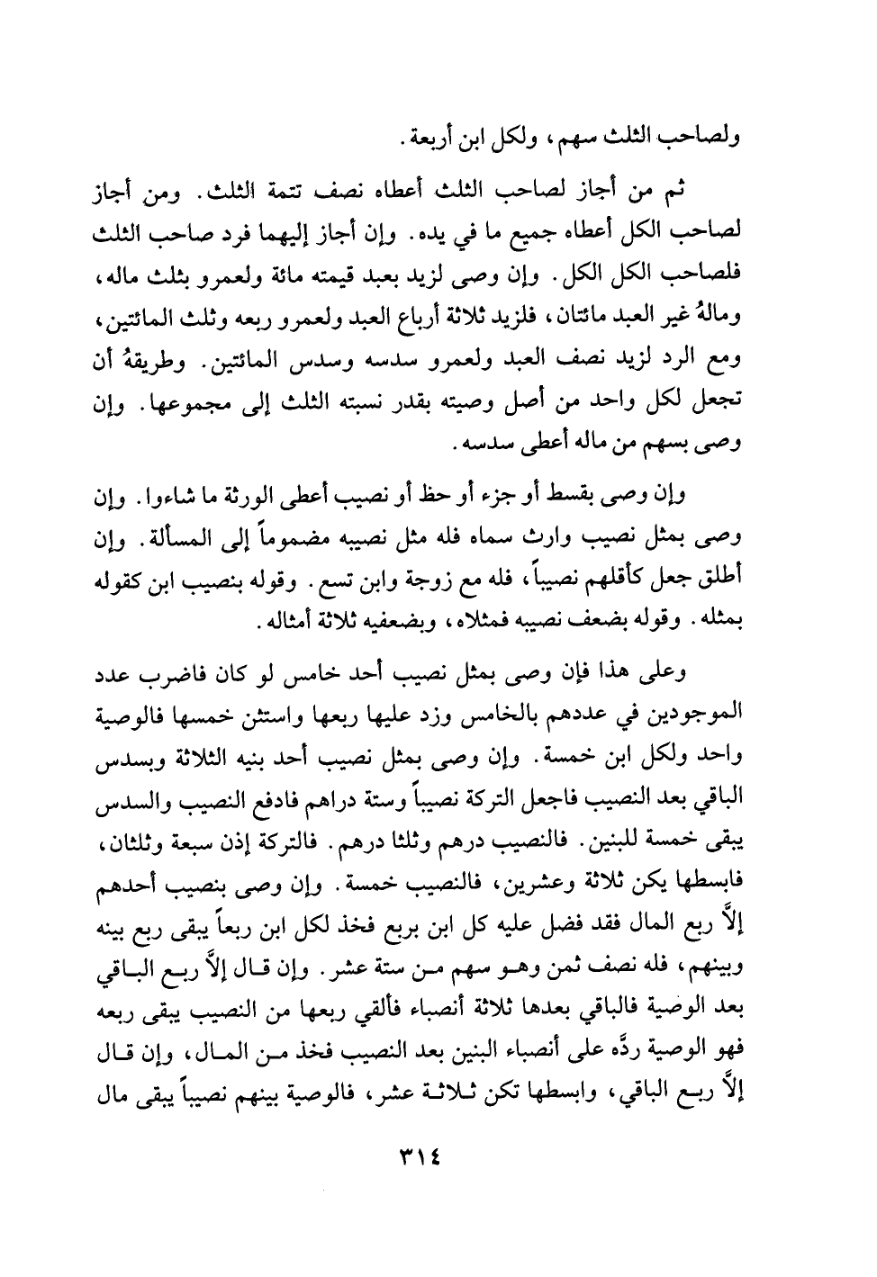 وعلى هذا فإن وصى بمثل نصيب أحد خامس لو كان فاضرب عدد الموجودين في عددهم بالخامس وزد عليها ربعها واستثن خمسها فالوصية واحد ولكل ابن خمسة. وإن وصى بمثل نصيب أحد بنيه الثلاثة وبسدس الباقي بعد النصيب فاجعل التركة نصيبًا وستة دراهم فادفع النصيب والسدس يبقى خمسة للبنين. فالنصيب درهم وثلثا درهم. فالتركة إذن سبعة وثلثان، فابسطها يكن ثلاثة وعشرين، فالنصيب خمسة. وإن وصى بنصيب أحدهم إلَّا ربع المال فقد فضل عليه كل ابن بربع فخذ لكل ابن ربعًا يبقى ربع بينه وبينهم، فله نصف ثمن وهو سهم من ستة عشر. وإن قال إلَّا ربع الباقي بعد الوصية فالباقي بعدها ثلاثة أنصباء فألقي ربعها من النصيب يبقى ربعه فهو الوصية ردَّه على أنصباء البنين بعد النصيب فخذ من المال، وإن قال إلَّا ربع الباقي، وابسطها تكن ثلاثة عشر، فالوصية بينهم نصيبًا يبقى مال