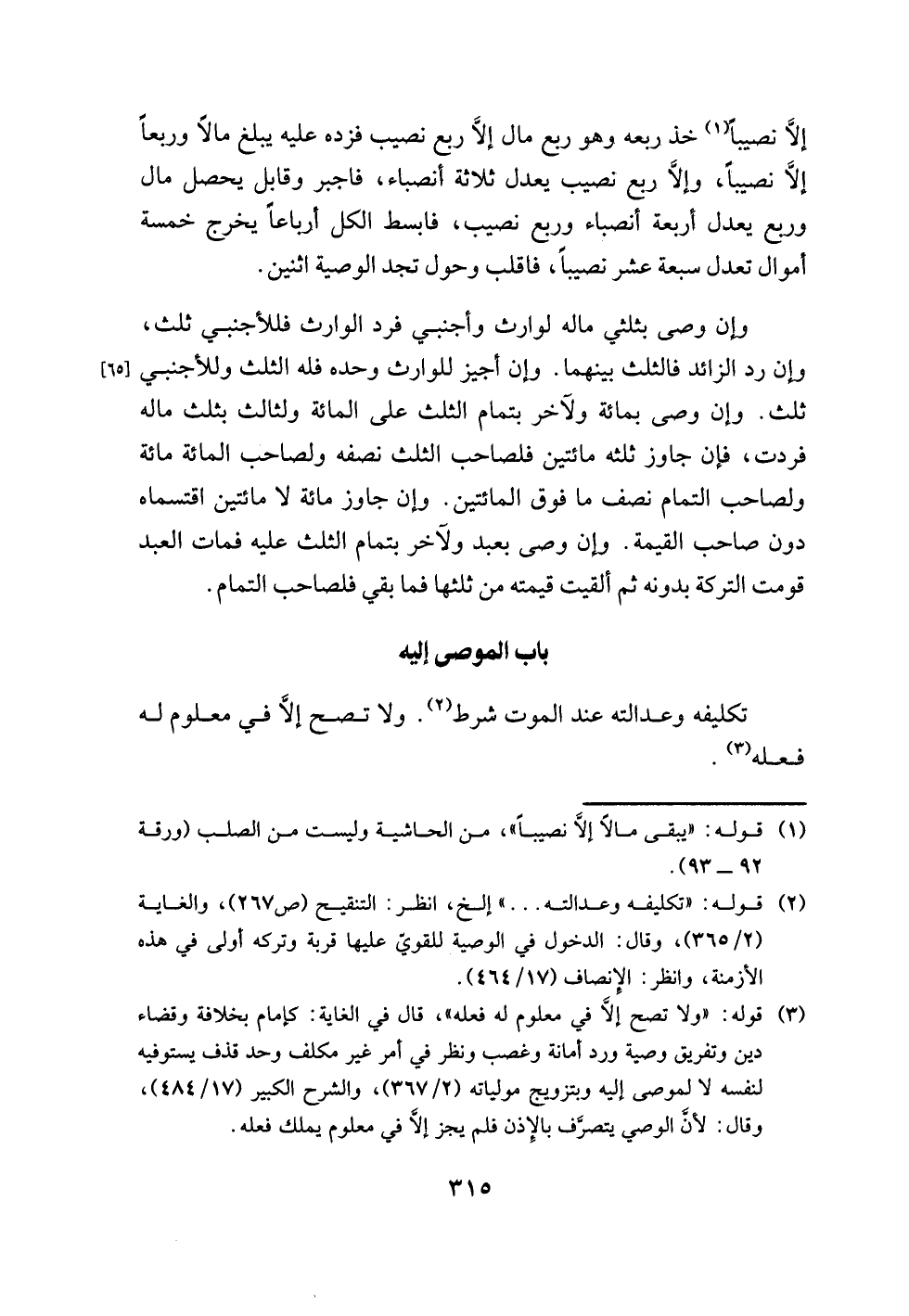 (¬2) قوله: "تكليفه وعدالته. . . " إلخ، انظر: التنقيح (ص 267)، والغاية (2/ 365)، وقال: الدخول في الوصية للقويّ عليها قربة وتركه أولى في هذه الأزمنة، وانظر: الإِنصاف (17/ 464).