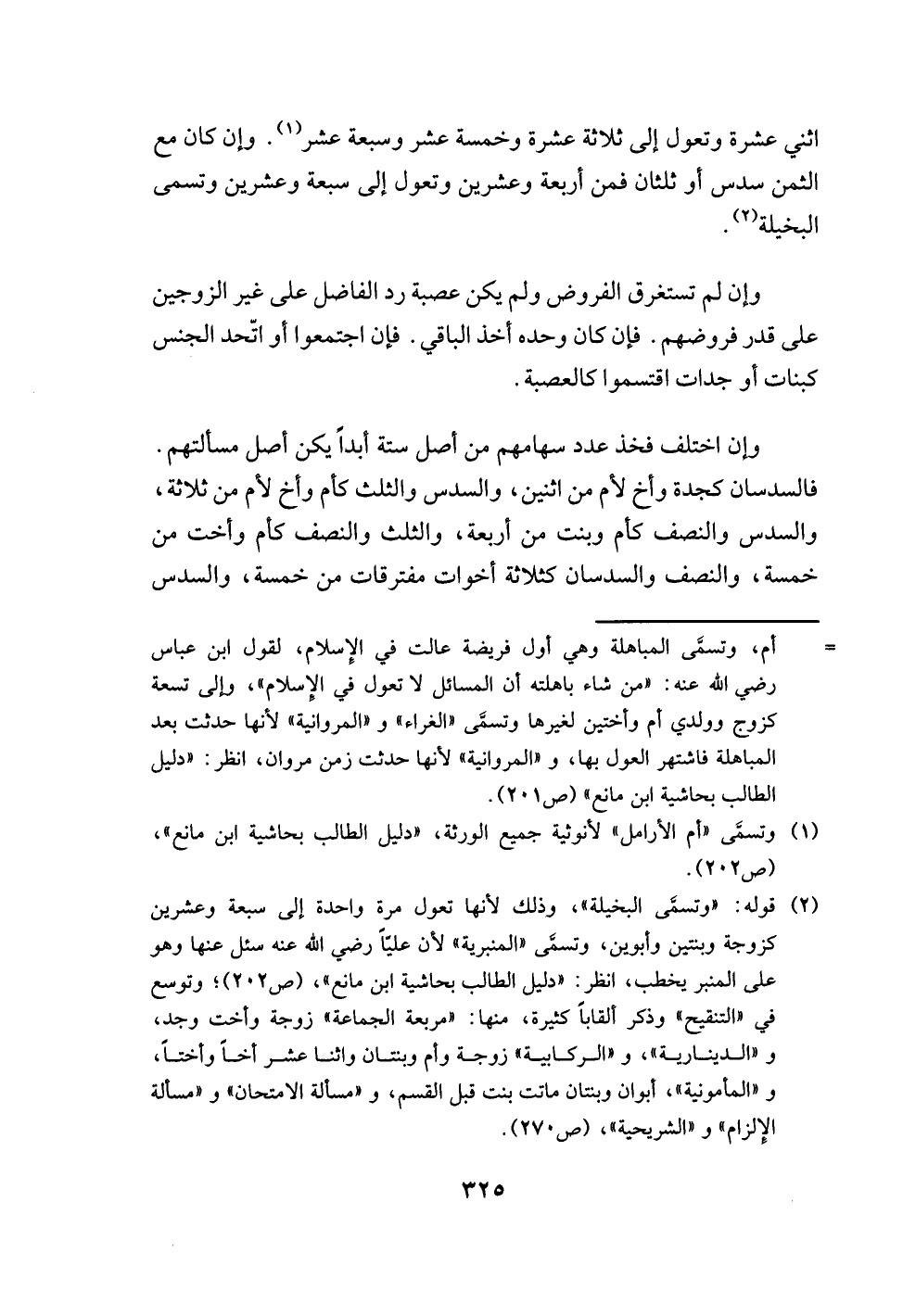 (¬2) قوله: "وتسمَّى البخيلة"، وذلك لأنها تعول مرة واحدة إلى سبعة وعشرين كزوجة وبنتين وأبوين، وتسمَّى "المنبرية" لأن عليًّا رضي اللَّه عنه سئل عنها وهو على المنبر يخطب، انظر: "دليل الطالب بحاشية ابن مانع"، (ص 202)؛ وتوسع في "التنقيح" وذكر ألقابًا كثيرة، منها: "مربعة الجماعة" زوجة وأخت وجد، و"الدينارية"، و"الركابية" زوجة وأم وبنتان واثنا عشر أخًا وأختًا، و"المأمونية"، أبوان وبنتان ماتت بنت قبل القسم، و"مسألة الامتحان" و"مسألة الإِلزام" و"الشريحية"، (ص 270).