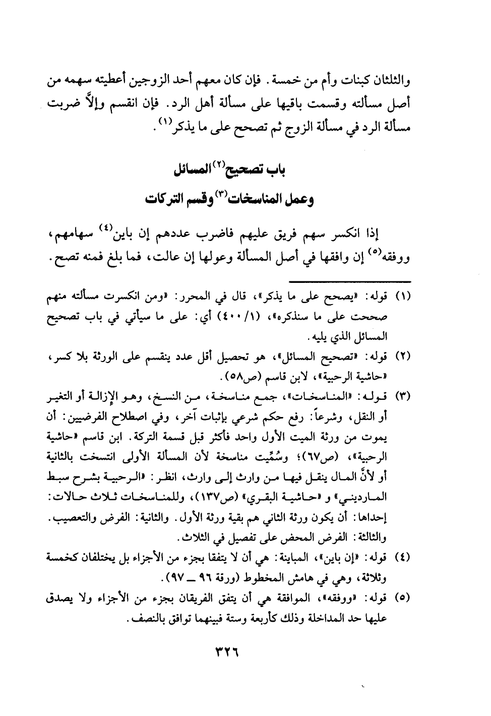 (¬2) قوله: "تصحيح المسائل"، هو تحصيل أقل عدد ينقسم على الورثة بلا كسر، "حاشية الرحبية"، لابن قاسم (ص 58).