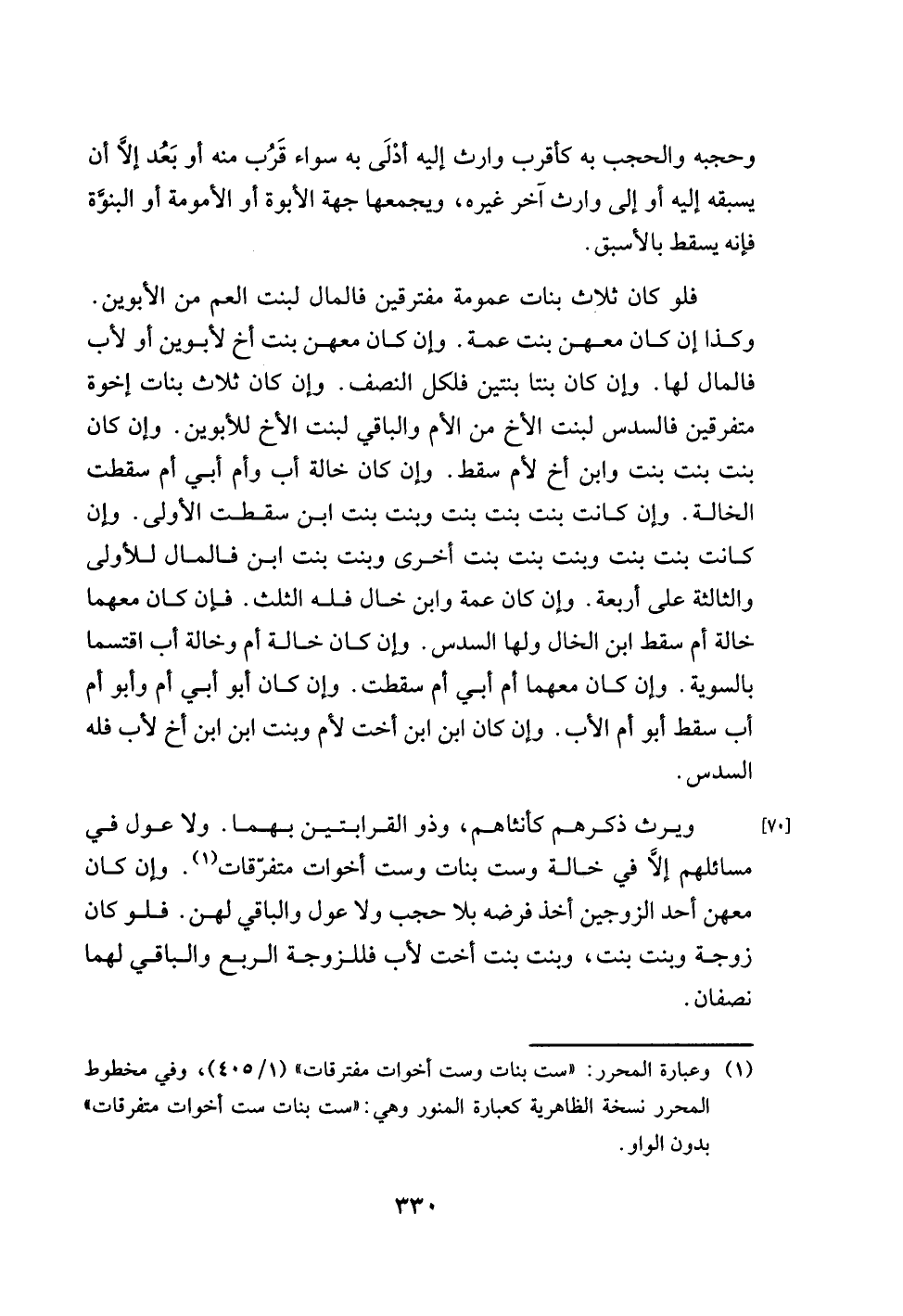 (¬1) وعبارة المحرر: "ست بنات وست أخوات مفترقات" (1/ 405)، وفي مخطوط المحرر نسخة الظاهرية كعبارة المنور وهي: "ست بنات ست أخوات متفرقات" بدون الواو.