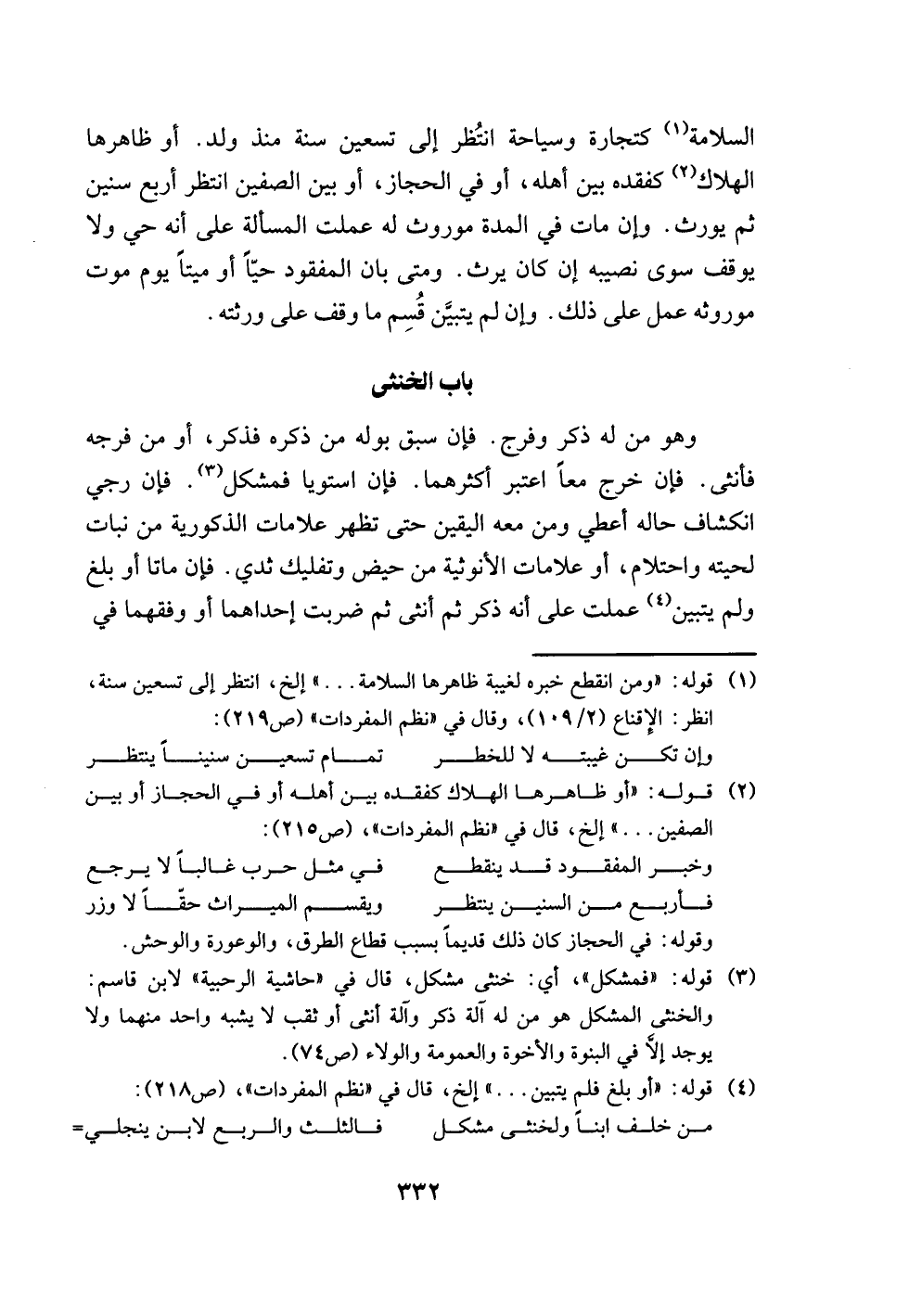 (¬1) قوله: "ومن انقطع خبره لغيبة ظاهرها السلامة. . . " إلخ، انتظر إلى تسعين سنة، انظر: الإِقناع (2/ 109)، وقال في "نظم المفردات" (ص 219):