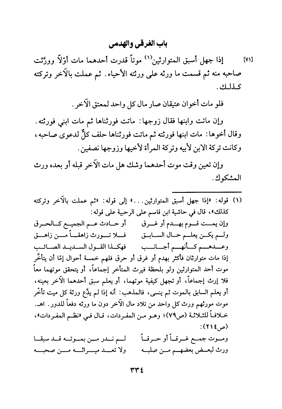 إذا مات متوارثان فأكثر بهدم أو غرق أو حرق فلهم خمسة أحوال إمّا أن يتأخَّر موت أحد المتوارثين ولو بلحظة فيرث المتأخر إجماعًا، أو يتحقق موتهما معًا فلا إرث إجماعًا، أو تجهل كيفية موتهما، أو يعلم سبق أحدهما الآخر بعينه، أو يعلم السابق بالموت ثم ينسى، فالمذهب: أنه إذا لم يدَّع ورثة كل ميت تأخّر موت مورثهم ورث كل واحد من تلاد مال الآخر دون ما ورثه دفعًا للدور. اهـ. خلافًا للثلاثة (ص 79)؛ وهو من المفردات، قال في "نظم المفردات"، (ص 214):