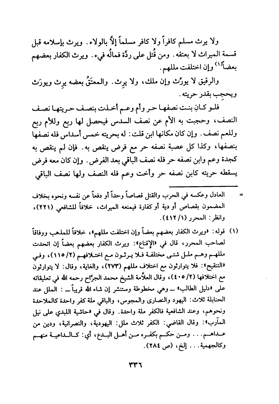 (¬1) قوله: "ويرث الكفار بعضهم بعضًا وإن اختلفت مللهم"، خلافًا للمذهب ووفاقًا لصاحب المحرر، قال في "الإقناع": ويرث الكفار بعضهم بعضًا إن اتحدت مللهم وهم ملل شتى مختلفة فلا يرثون مع اختلافهم (2/ 115)، وفي "التنقيح": فلا يتوارثون مع اختلاف مللهم (273)، والغاية، وقال: لا يتوارثون مع اختلافها (2/ 405)، وقال العلَّامة الشيخ محمد الجرَّاح رحمه اللَّه في تعليقاته على "دليل الطالب" -وهي مخطوطة وستنشر إن شاء اللَّه قريبًا-: الملل عند الحنابلة ثلاث: اليهود والنصارى والمجوس، والباقي ملة كفر واحدة كالملاحدة ونحوهم، وعند الشافعية فالكفر ملة واحدة. وقال في "حاشية اللبدي على نيل المآرب": وقال القاضي: الكفر ثلاث ملل: اليهودية، والنصرانية، ودين من عداهم. . . ومن حكم بكفره من أهل البدع، أي: كالداعية منهم وكالجهمية. . . إلخ، (ص 284).