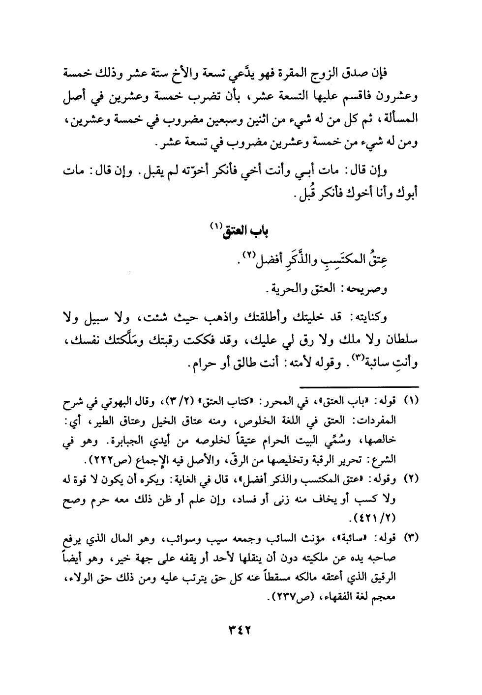 (¬2) وقوله: "عتق المكتسب والذكر أفضل"، قال في الغاية: ويكره أن يكون لا قوة له ولا كسب أو يخاف منه زنى أو فساد، وإن علم أو ظن ذلك معه حرم وصح (2/ 421).