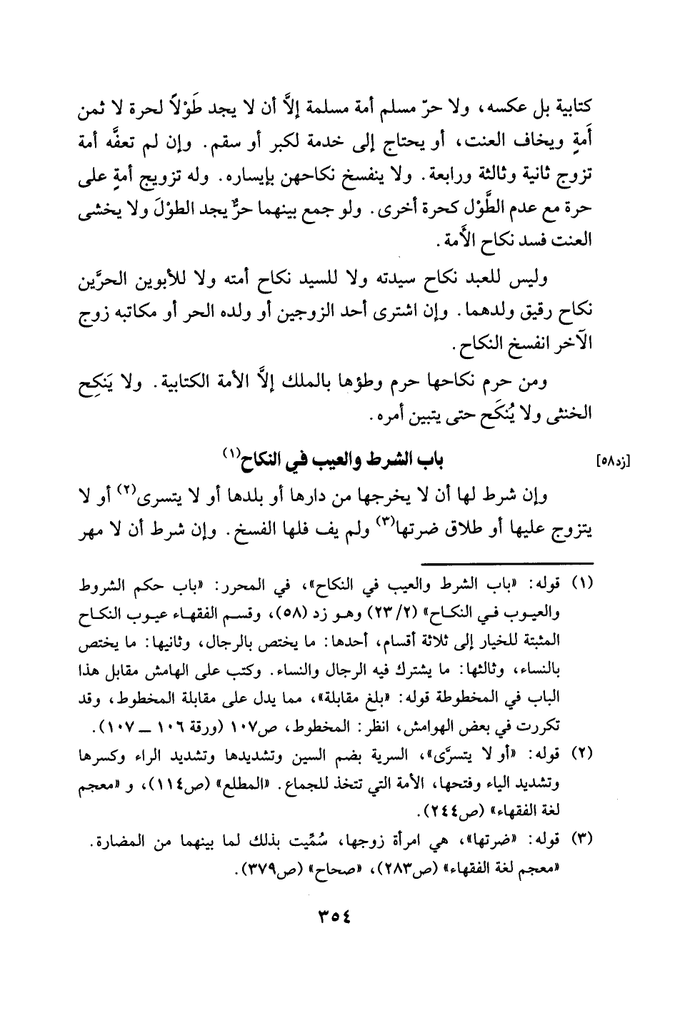 (¬1) قوله: "باب الشرط والعيب في النكاح"، في المحرر: "باب حكم الشروط والعيوب في النكاح" (2/ 23) وهو زد (58)، وقسم الفقهاء عيوب النكاح المثبتة للخيار إلى ثلاثة أقسام، أحدها: ما يختص بالرجال، وثانيها: ما يختص بالنساء، وثالثها: ما يشترك فيه الرجال والنساء. وكتب على الهامش مقابل هذا الباب في المخطوطة قوله: "بلغ مقابلة"، مما يدل على مقابلة المخطوط، وقد تكررت في بعض الهوامش، انظر: المخطوط، ص 107 (ورقة 106 - 107).