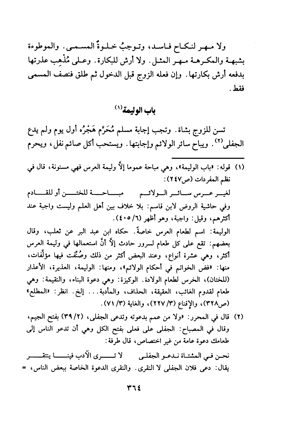(¬1) قوله: "باب الوليمة"، وهي مباحة عموما إلَّا وليمة العرس فهي مسنونة، قال في نظم المفردات (ص 247):