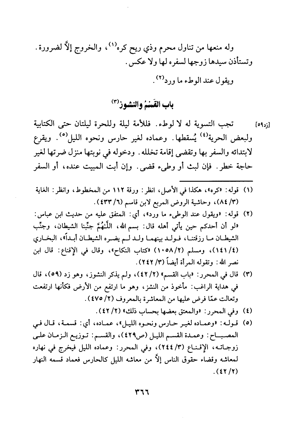 (¬3) قال في المحرر: "باب القسم" (2/ 42)، ولم يذكر النشوز، وهو زد (59)، قال في هداية الراغب: مأخوذ من النشز، وهو ما ارتفع من الأرض فكأنها ارتفعت وتعالت عما فرض عليها من المعاشرة بالمعروف (2/ 475).