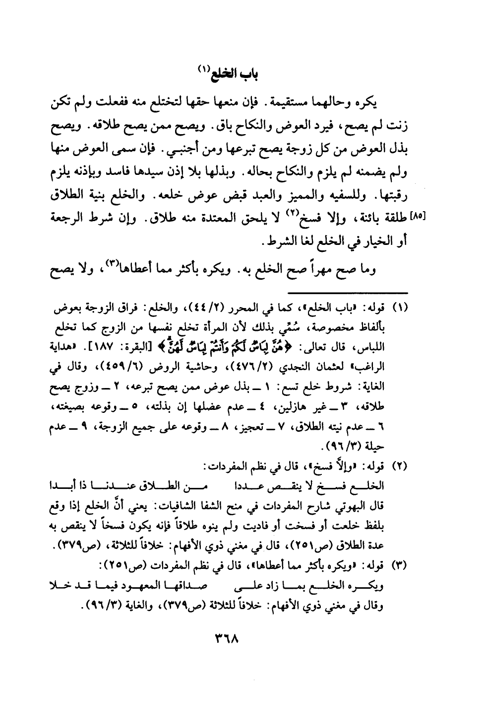 قال البهوتي شارح المفردات في منح الشفا الشافيات: يعني أنَّ الخلع إذا وفع بلفظ خلعت أو فسخت أو فاديت ولم ينوه طلاقًا فإنه يكون فسخًا لا ينقص به عدة الطلاق (ص 251)، قال في مغني ذوي الأفهام: خلافًا للثلاثة، (ص 379).
