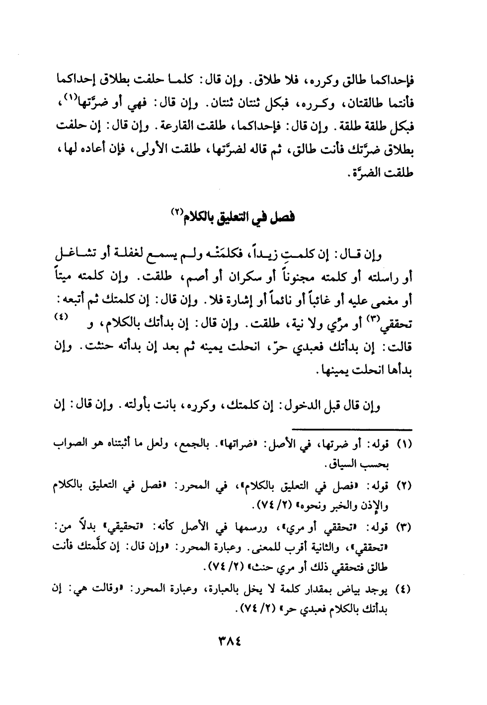 (¬4) يوجد بياض بمقدار كلمة لا بخل بالعبارة، وعبارة المحرر: "وقالت هي: إن بدأتك بالكلام فعبدي حر" (2/ 74).