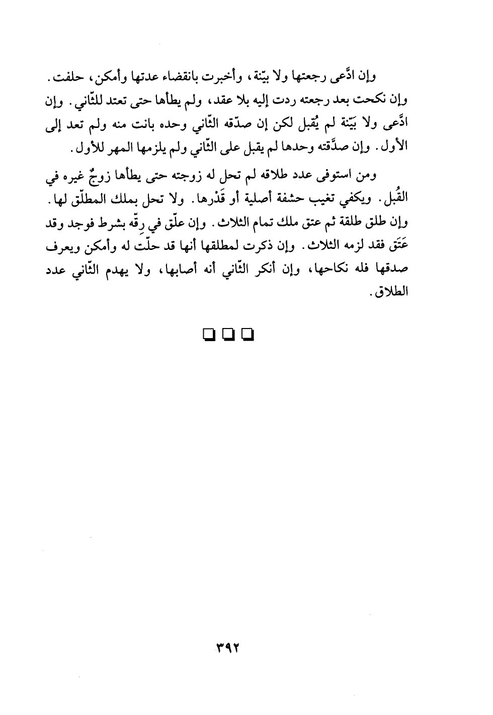 ومن استوفى عدد طلاقه لم تحل له زوجته حتى يطأها زوجٌ غيره في القُبل. ويكفي تغيب حشفة أصلية أو قَدْرها. ولا تحل بملك المطلّق لها. وإن طلق طلقة ثم عتق ملك تمام الثلاث. وإن علّق في رِقّه بشرط فوجد وقد عَتَق فقد لزمه الثلاث. وإن ذكرت لمطلقها أنها قد حلّت له وأمكن ويعرف صدقها فله نكاحها، وإن أنكر الثّاني أنه أصابها، ولا يهدم الثّاني عدد الطلاق.