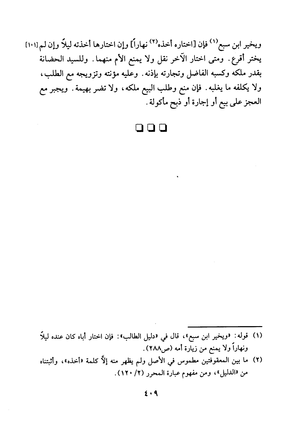 ويخير ابن سبع (¬1) فإن [اختاره أخذه (¬2) نهارًا]، وإن اختارها أخذته ليلًا وإن لم يختر أقرع. ومتى اختار الآخر نقل ولا يمنع الأم منهما. وللسيد الحضانة بقدر ملكه وكسبه الفاضل وتجارته بإذنه. وعليه مؤنته وتزويجه مع الطلب، ولا يكلفه ما يغلبه. فإن منع وطلب البيع ملكه، ولا تضر بهيمة. ويجبر مع العجز على بيع أو إجارة أو ذبح مأكولة.