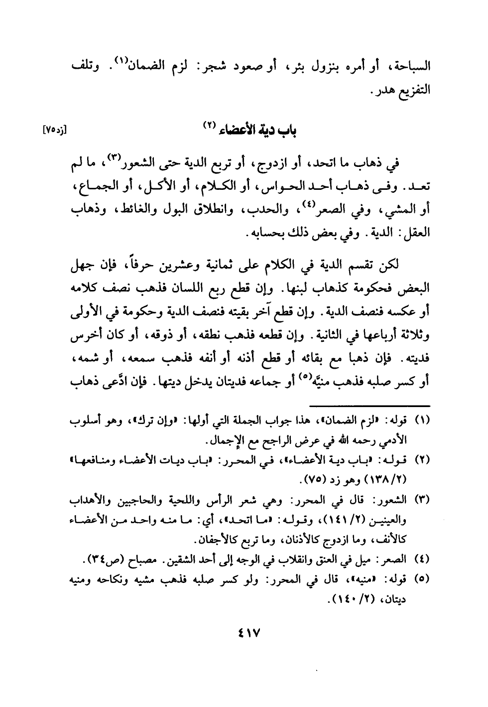 (¬2) قوله: "باب دية الأعضاء"، في المحرر: "باب ديات الأعضاء ومنافعها" (2/ 138) وهو زد (75).