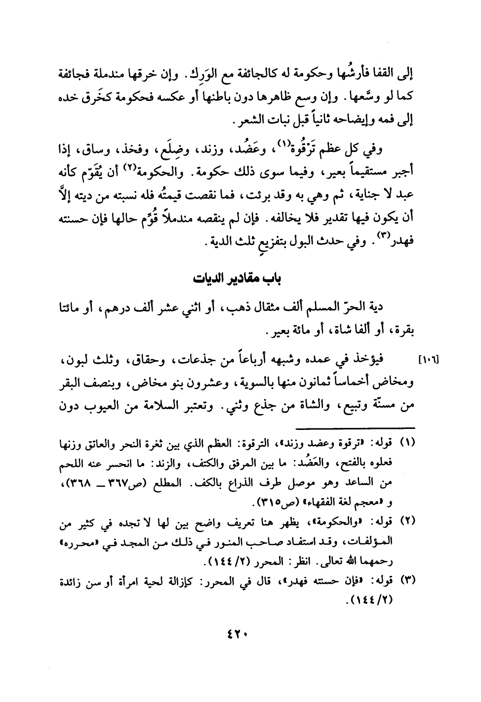 وفي كل عظم تَرْقُوة (¬1)، وعَضُد، وزند، وضِلَع، وفخذ، وساق، إذا أجبر مستقيمًا بعير، وفيما سوى ذلك حكومة. والحكومة (¬2) أن يُقَوّم كأنه عبد لا جناية، ثم وهي به وقد برئت، فما نقصت قيمتُه فله نسبته من ديته إلَّا أن يكون فيها تقدير فلا يخالفه. فإن لم ينقصه مندملًا قُوِّم حالها فإن حسنته فهدر (¬3). وفي حدث البول بتفزيعٍ ثلث الدية.