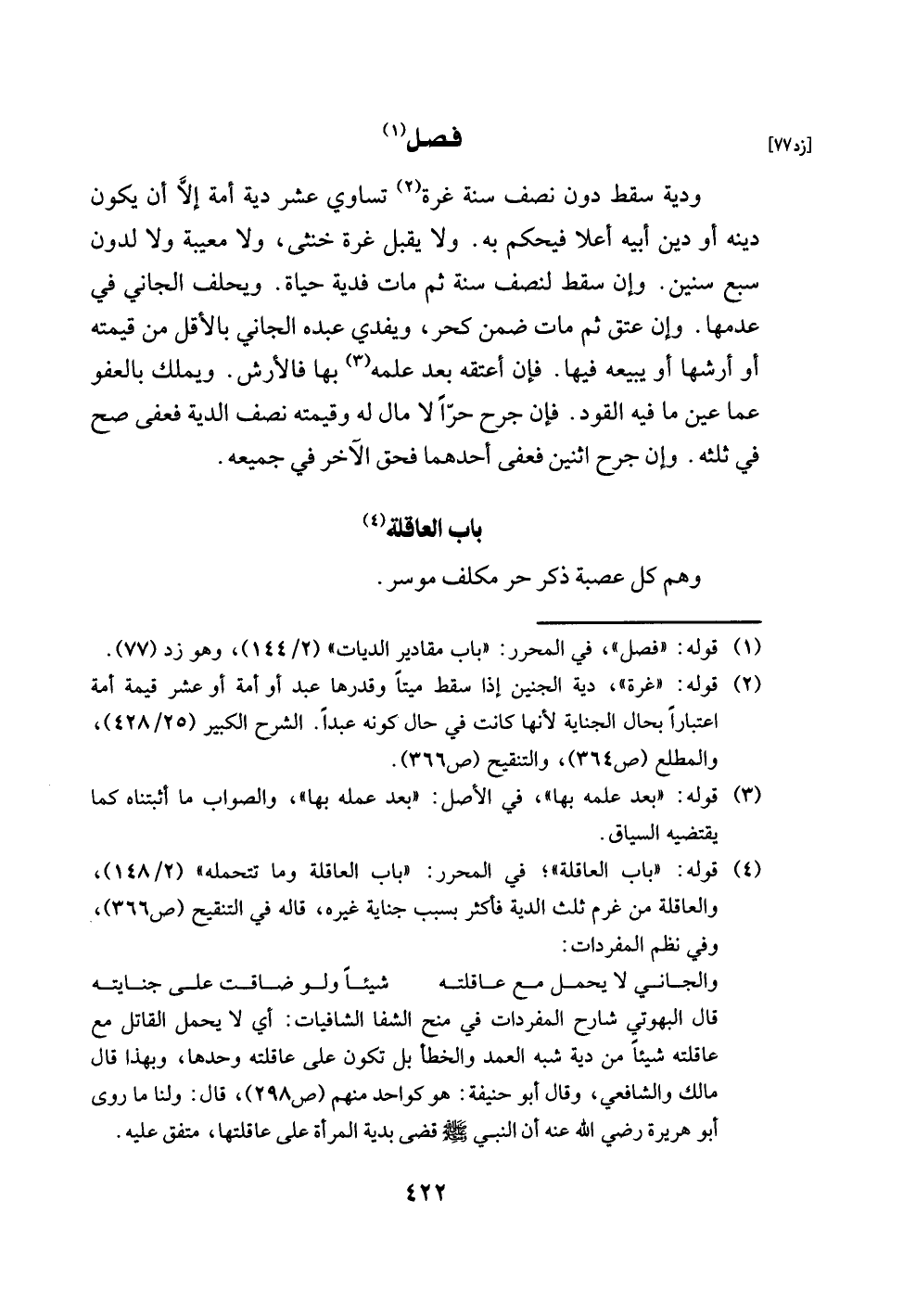 (¬4) قوله: "باب العاقلة"؛ في المحرر: "باب العاقلة وما تتحمله" (2/ 148)، والعاقلة من غرم ثلث الدية فأكثر بسبب جناية غيره، قاله في التنقيح (ص 366)، وفي نظم المفردات: