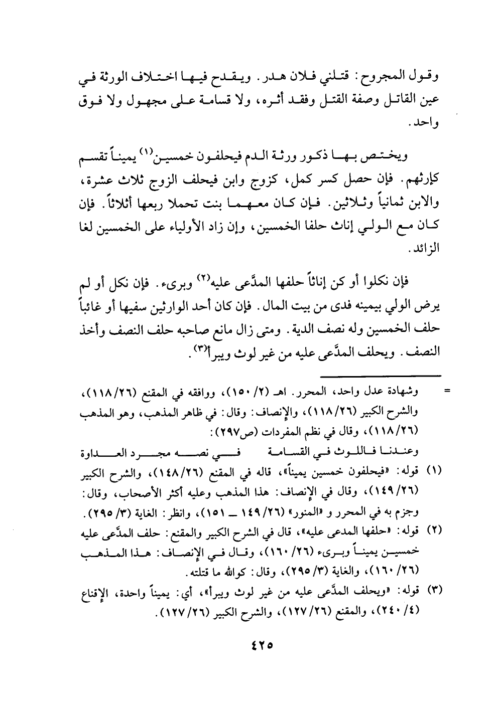 (¬1) قوله: "فيحلفون خمسين يمينًا"، قاله في المقنع (26/ 148)، والشرح الكبير (26/ 149)، وقال في الإنصاف: هذا المذهب وعليه أكثر الأصحاب، وقال: وجزم به في المحرر و"المنور" (26/ 149 - 151)، وانظر: الغاية (3/ 295).