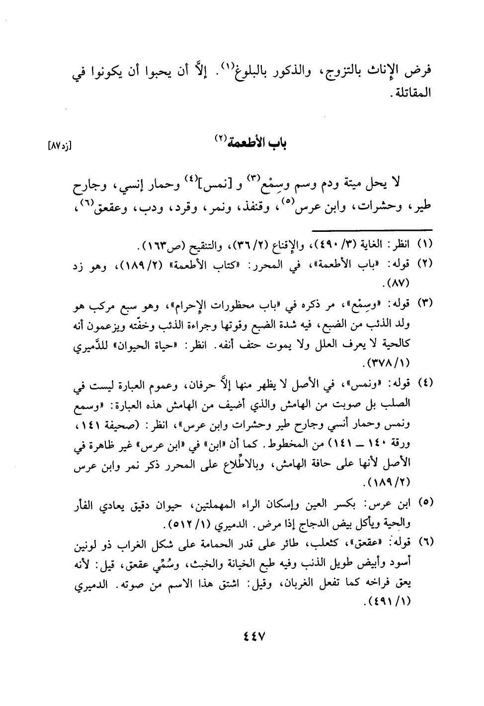 (¬4) قوله: "ونمس"، في الأصل لا يظهر منها إلَّا حرفان، وعموم العبارة ليست في الصلب بل صوبت من الهامش والذي أضيف من الهامش هذه العبارة: "وسمع ونمس وحمار أنسي وجارح طير وحشرات وابن عرس"، انظر: (صحيفة 141، ورقة 140 - 141) من المخطوط. كما أن "ابن" في "ابن عرس" غير ظاهرة في الأصل لأنها على حافة الهامش، وبالاطِّلاع على المحرر ذكر نمر وابن عرس (2/ 189).