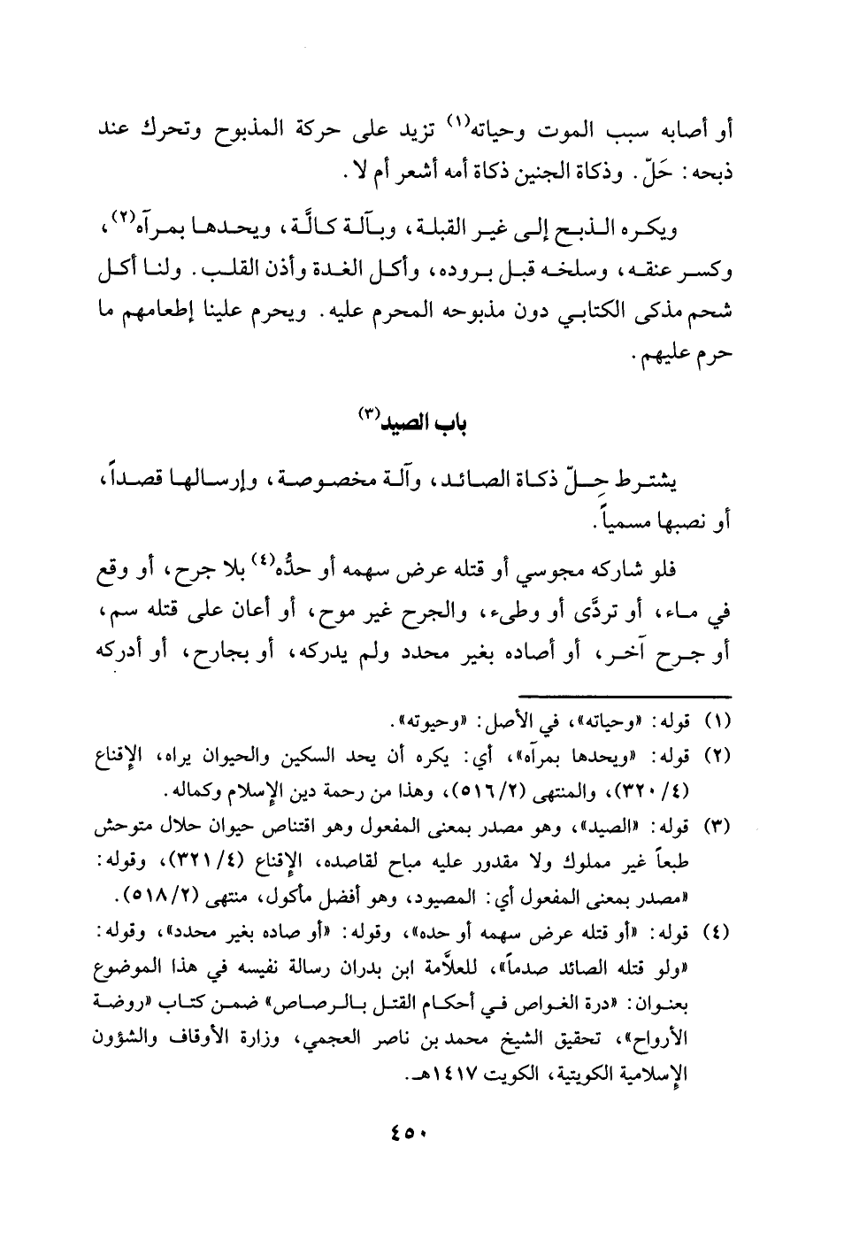 (¬4) قوله: "أو قتله عرض سهمه أو حده"، وقوله: "أو صاده بغير محدد"، وقوله: "ولو قتله الصائد صدمًا"، للعلَّامة ابن بدران رسالة نفيسه في هذا الموضوع بعنوان: "درة الغواص في أحكام القتل بالرصاص" ضمن كتاب "روضة الأرواح"، تحقيق الشيخ محمد بن ناصر العجمي، وزارة الأوقاف والشؤون الإِسلامية الكويتية، الكويت 1417 هـ.
